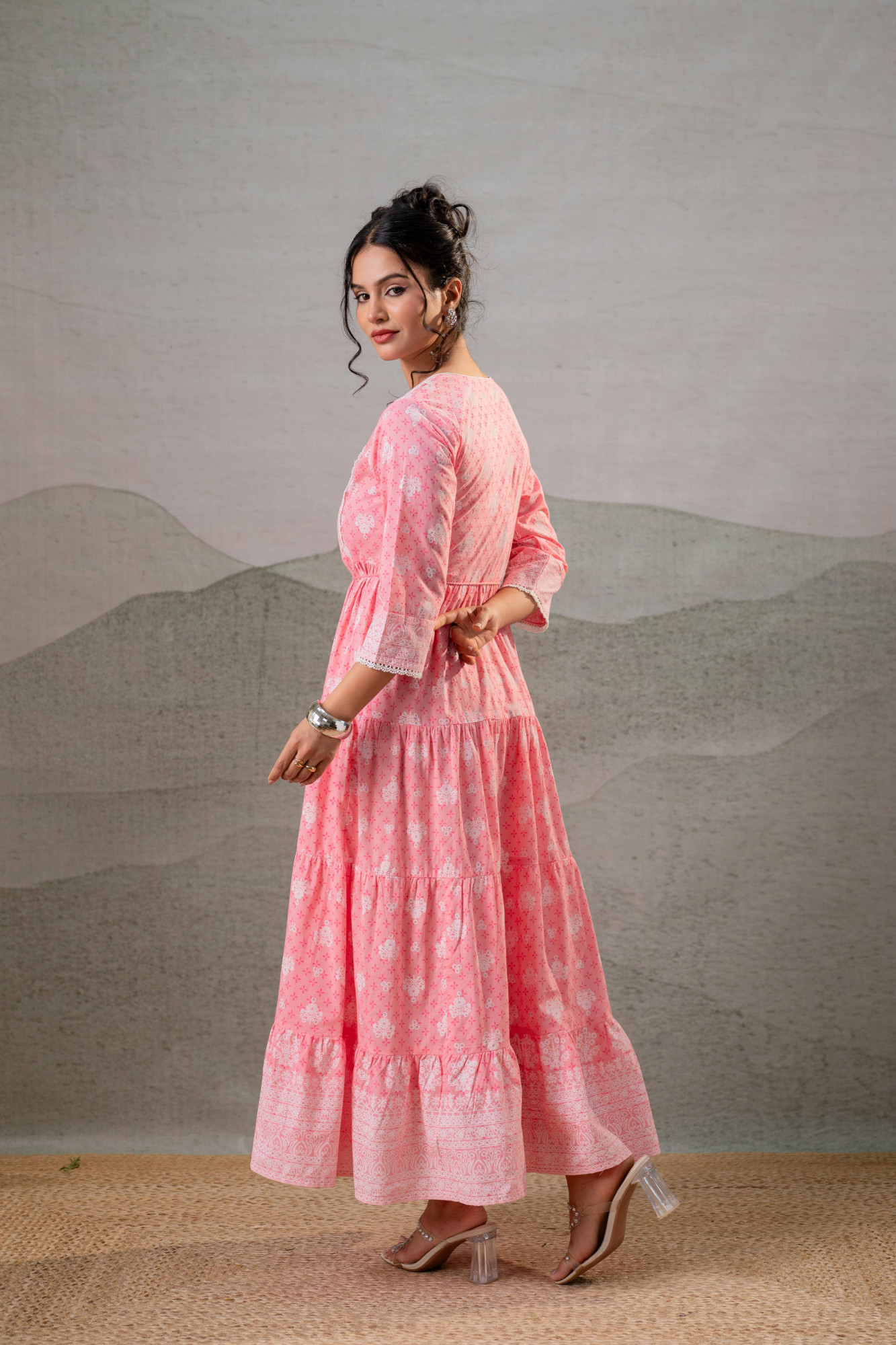 A graceful baby pink Anarkali dress adorned with delicate white floral motifs and a statement printed border. Featuring a softly gathered waist and flowing tiered silhouette, this dress blends traditional charm with effortless modern comfort—perfect for elegant daytime occasions.Pack of Content Each Size Set:- 1 LONGDRESS, 1 DORI Top Type :- Dress Top Pattern :- Printed Print Type :- Ethnic Top Fabric :- Cotton Top Design Styling :- A-Line Long Dress Top Hemline :- Flared Top Length :- Ankle length Top Shape :- A-line Neck :- Round neck with V-notch Sleeve Length :- Three-quarter sleeves Sleeve Styling :- Regular Top Closure :- Slip-on Occasion :- Semi-Festive Ornamentation :- Dori,Tassels,Lace