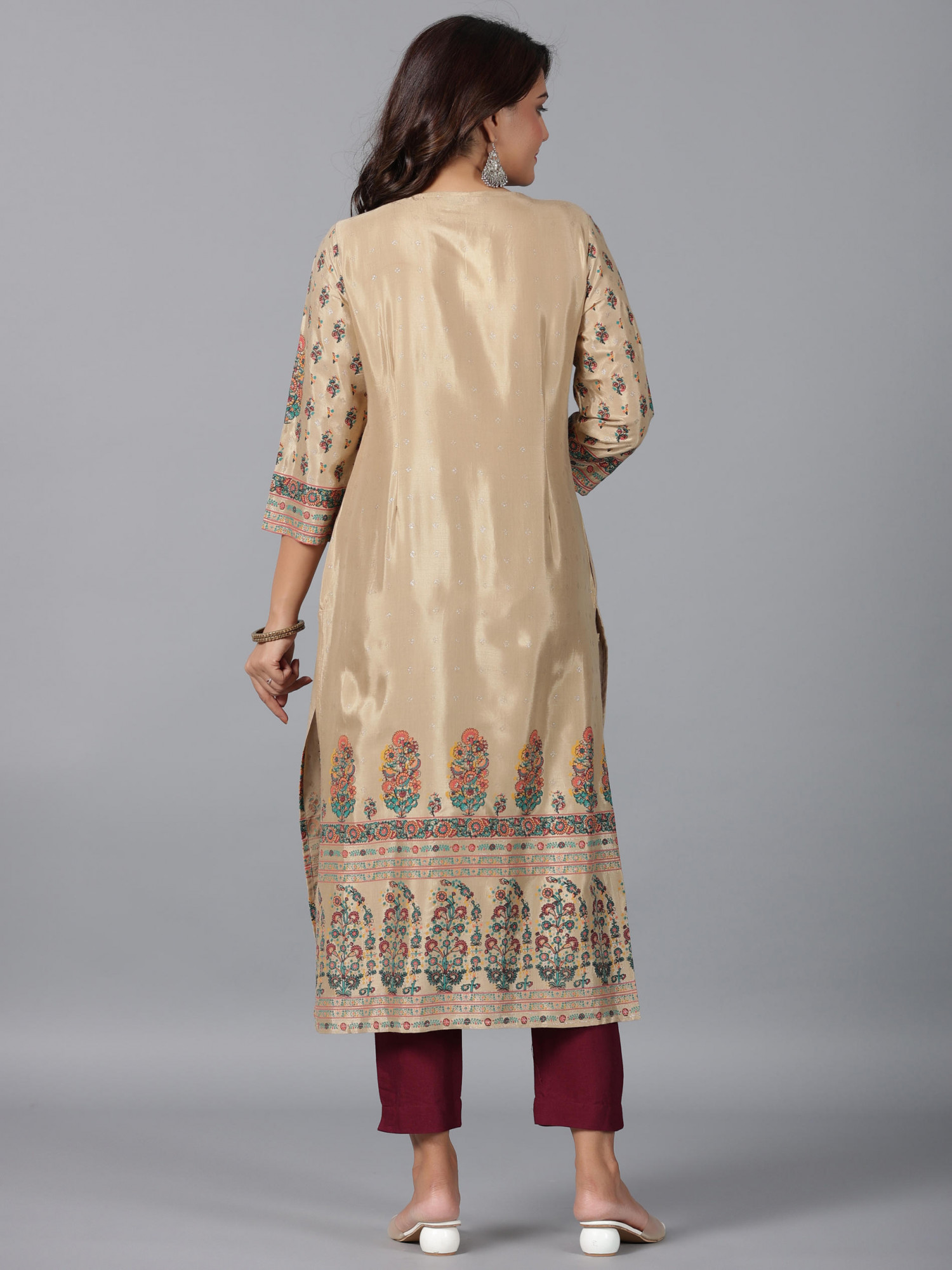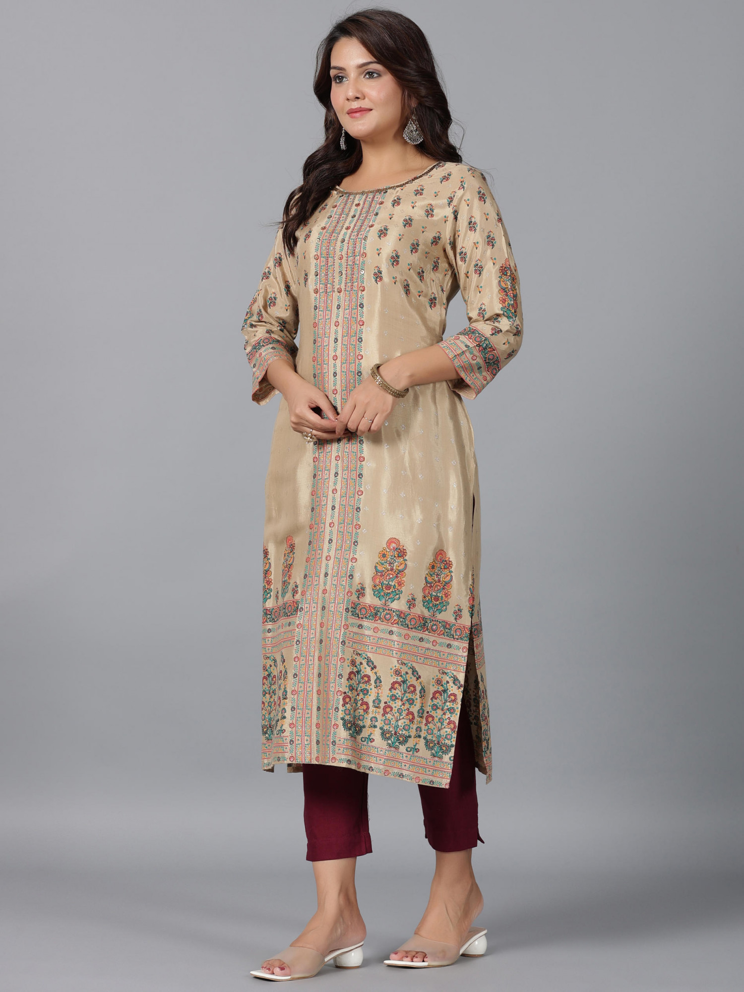 Beige floral printed viscose kurta is embellished with delicate beads and sequins. This calf-length, straight design features a round neck and three-quarter regular sleeves, offering a sophisticated and elegant look for both casual outings and festive occasions.Pack of Content:- 1 Kurta Prominent Color:- Beige Material Care Description:- viscose Shantoon Top Type:- Kurta Top Pattern:- Printed Print Type:- Floral Top Fabric:- Viscose Shantoon Top Design Styling:- Straight Top Hemline:- Straight Top Shape:- Straight Top Length:- Calf length Neck:- Round Neck Sleeve Length:- Three Quarter Sleeves Top Closure:- Slip-On Occasion:- Festive Ornamentation:- Sequins & Beads Top Length In Inches:- 45