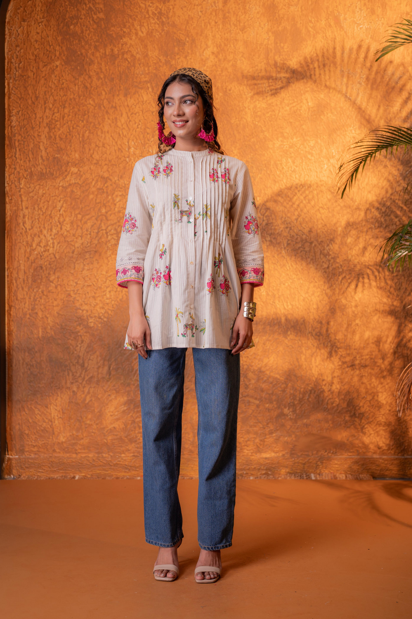 A soft and graceful tunic elevated with delicate pintucks and playful tropical floral motifs. The design beautifully merges structure and fluidity, featuring fine vertical textures with vibrant placement prints, making it a perfect blend of elegance and relaxed bohemian charm.