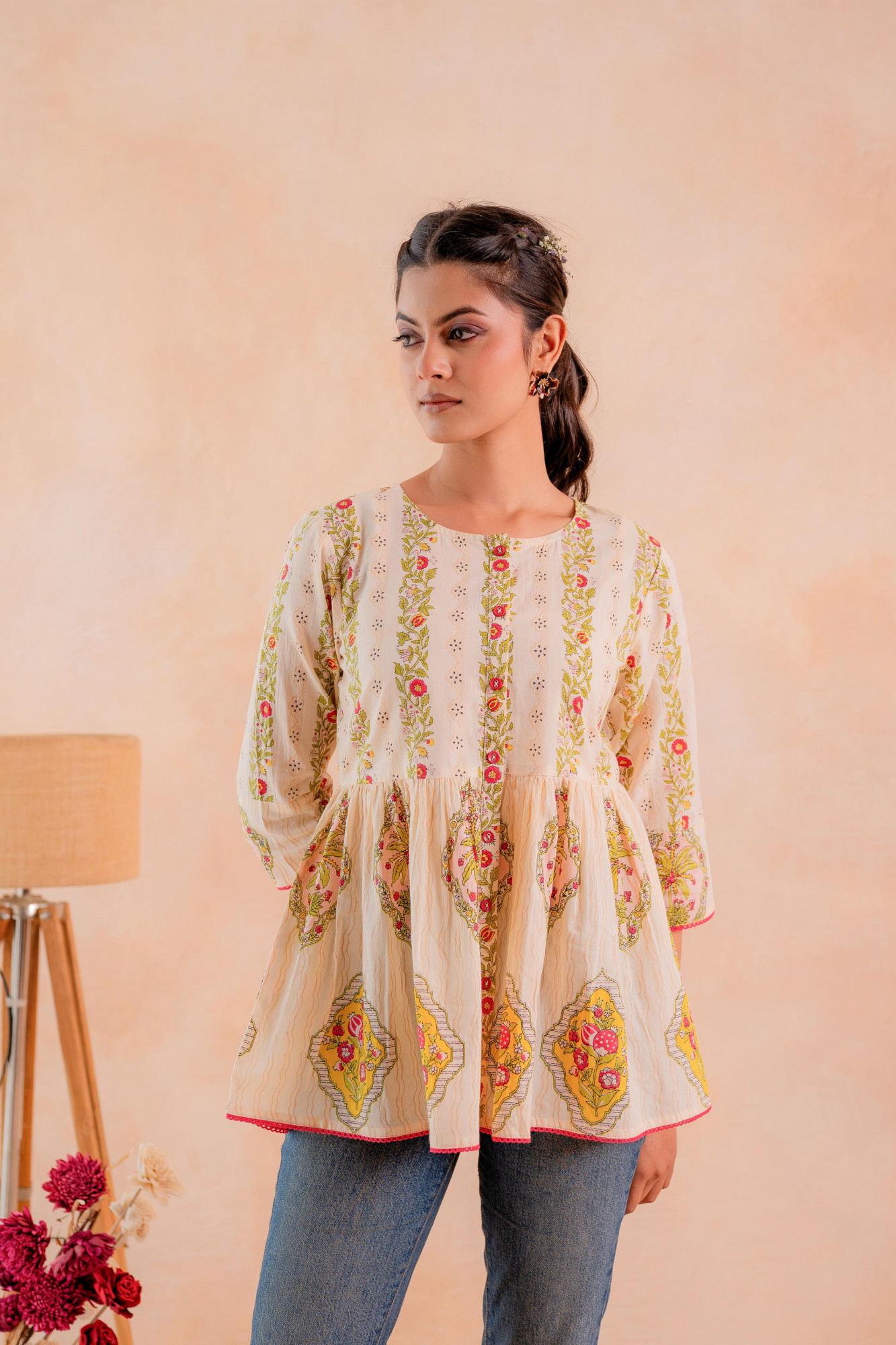 This vibrant beige ethnic tunic showcases traditional floral and geometric motifs in an all-over print. Designed with a gathered waist and flared silhouette, it offers a graceful fall and comfortable wear. The round neckline with a button placket adds classic charm, making it perfect for everyday ethnic styling and casual festive occasions.Pack of Content Each Size Set:- 1 TUNIC Top Type :- Tunic Top Pattern :- Printed Print Type :- Floral Top Fabric :- Cotton Top Design Styling :- A-line Short Kurta Top Hemline :- Flared Top Length :- Mid-thigh length Top Shape :- A-line Neck :- Round neck Sleeve Length :- Three-quarter sleeves Sleeve Styling :- Regular Top Closure :- Button placket (front) Occasion :- Casual Ornamentation :- Buttons