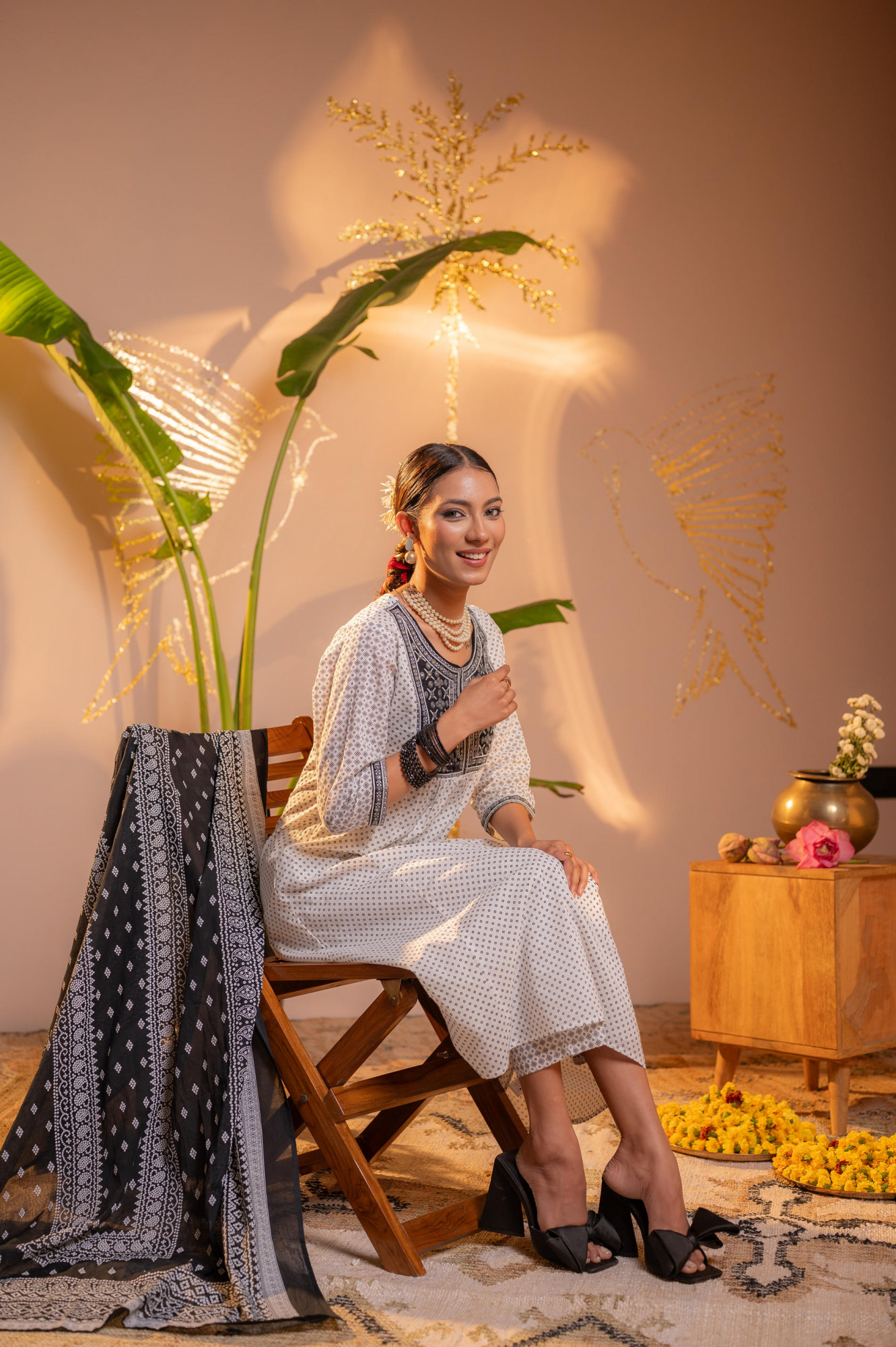 A graceful black and white kurta set featuring intricate traditional-inspired prints and a bold yoke design. Paired with straight printed pants and a richly bordered dupatta, this ensemble reflects timeless elegance blended with modern comfort—perfect for refined ethnic daywear.vPack of Content Each Size Set:- 1 KURTA, 1 PANT, 1 DUPATTA Top Type :- Kurta Dupatta(Yes, No) :- Yes Top Pattern :- Printed Print Type :- Ajrakh-inspired Top Fabric :- Cotton Top Design Styling :- A-Line kurta Top Hemline :- Straight Top Length :- Knee length Top Shape :- A-line Neck :- Round neck with V-notch Sleeve Length :- Three-quarter sleeves Sleeve Styling :- Regular Top Closure :- Slip-on Bottom Type :- Pant Bottom Fabric :- Cotton Bottom Pattern :- Printed Waistband :- Partially elasticated Occasion :- Semi-Festive Ornamentation :- Lace Dupatta Fabric :- Cotton Dupatta Pattern :- Printed