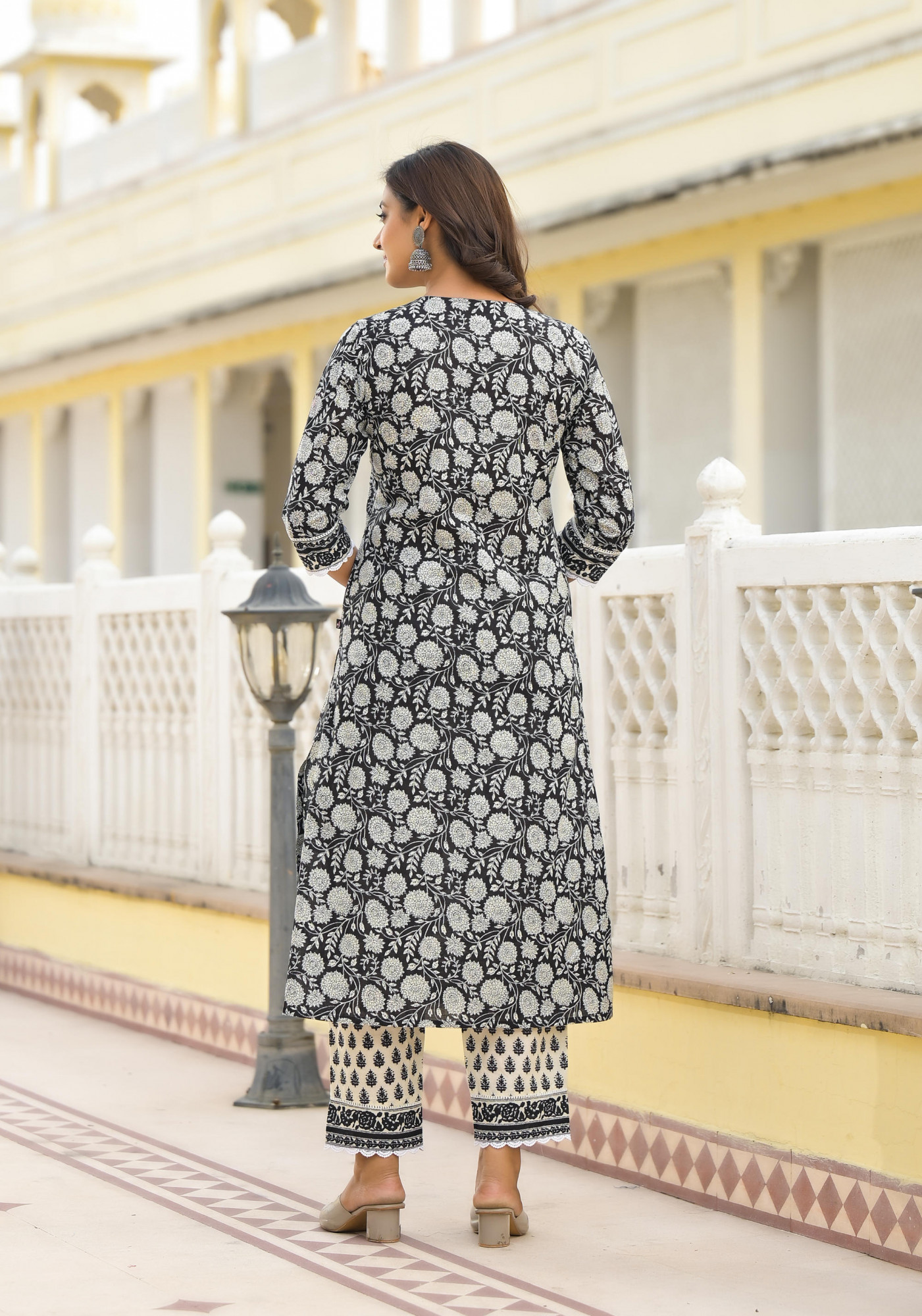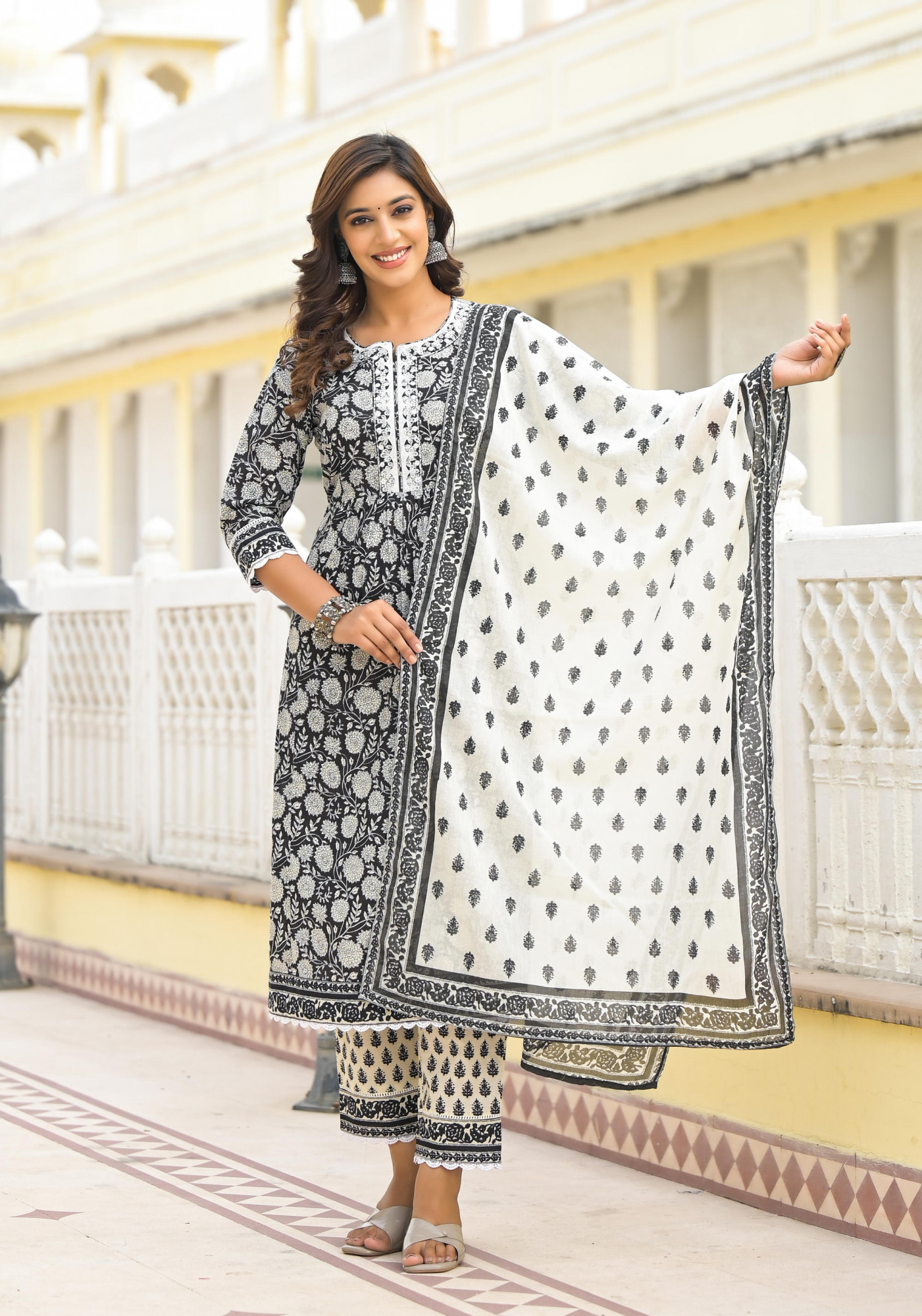 Black Floral Printed Cotton Kurta Pant And Dupatta Set Is Adorned With Delicate Thread Work And Lace, Creating A Charming And Stylish Look. The Knee-Length Kurta Features A Flattering Fit & Flare Silhouette, A Notch Neckline, And Three-Quarter Regular Sleeves. Paired With Printed Slip-On PantsPack of Content:- 1 Kurta, 1 Pant, 1 Dupatta Top Type:- Kurta Dupatta(Yes, No):- Yes Top Pattern:- Printed Prin Type - Floral Top Fabric:- Cotton Top Design Styling:- Gathers Top Hemline:- A-line Top Length:- Knee length Top Shape:- Fit & Flare Neck:- Notch neckline Sleeve Length:- Three Quarter Sleeves Top Closure:- Slip-On Bottom Fabric:- Cotton Bottom Type:- Pants Bottom Pattern:- Printed Bottom Closure:- Slip On Waistband:- Partially Elasticated Occasion:- Casual Ornamentation:- Thread Work, Lace Dupatta Fabric:- Cotton Fit:- Straight Length in Inch:- 46