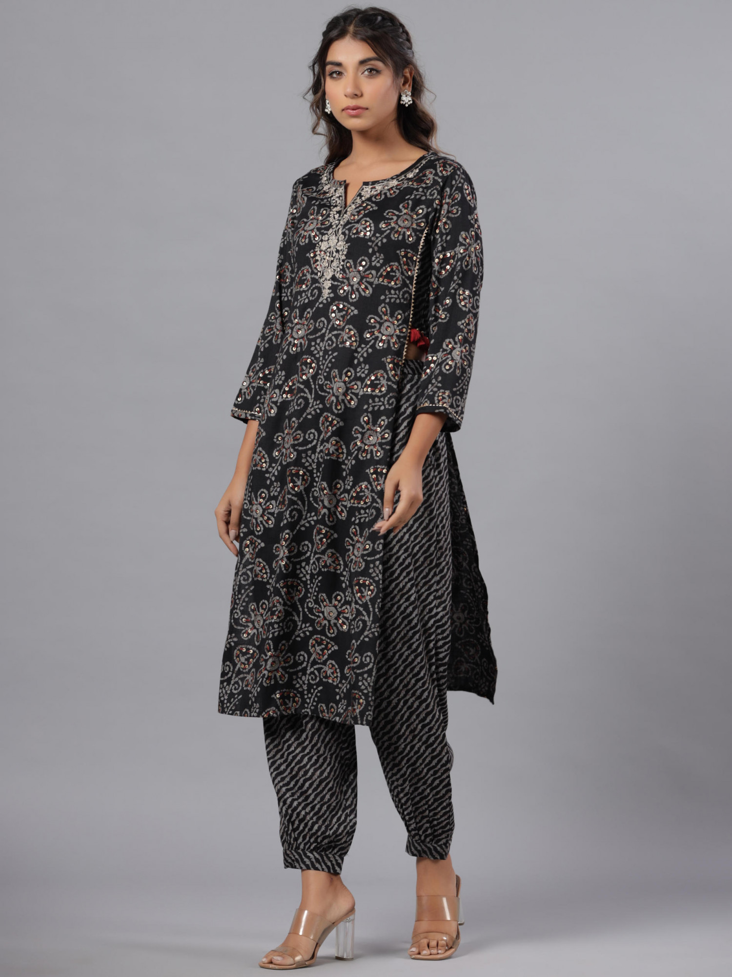 Black floral printed Liva Rayon kurta features a knee-length straight silhouette, notch neckline, and three-quarter regular sleeves, paired with ethnic motif printed Afghani slip-on pants for a trendy and comfortable ethnic look.Pack of Content:- 1 kurta, 1 Afgani Pant Prominent Color:- Black Material Care Description:- Liva Rayon Slub Top Type:- Kurta Top Pattern:- Printed Print Type:- Floral Top Fabric:- Liva Rayon Slub Top Design Styling:- Straight Top Hemline:- Straight Top Shape:- Straight Top Length:- Knee Length Neck:- Notch neckline Sleeve Length:- Three Quarter Sleeves Top Closure:- Slip-On Bottom Type:- Pant Bottom Fabric:- Liva Rayon Slub Bottom Pattern:- Printed Bottom Closure:- Slip on Waistband:- Partially Elasticated Ornamentation:- Sequins, Lace, Dori & Zari Work Top Length In Inches:- 44