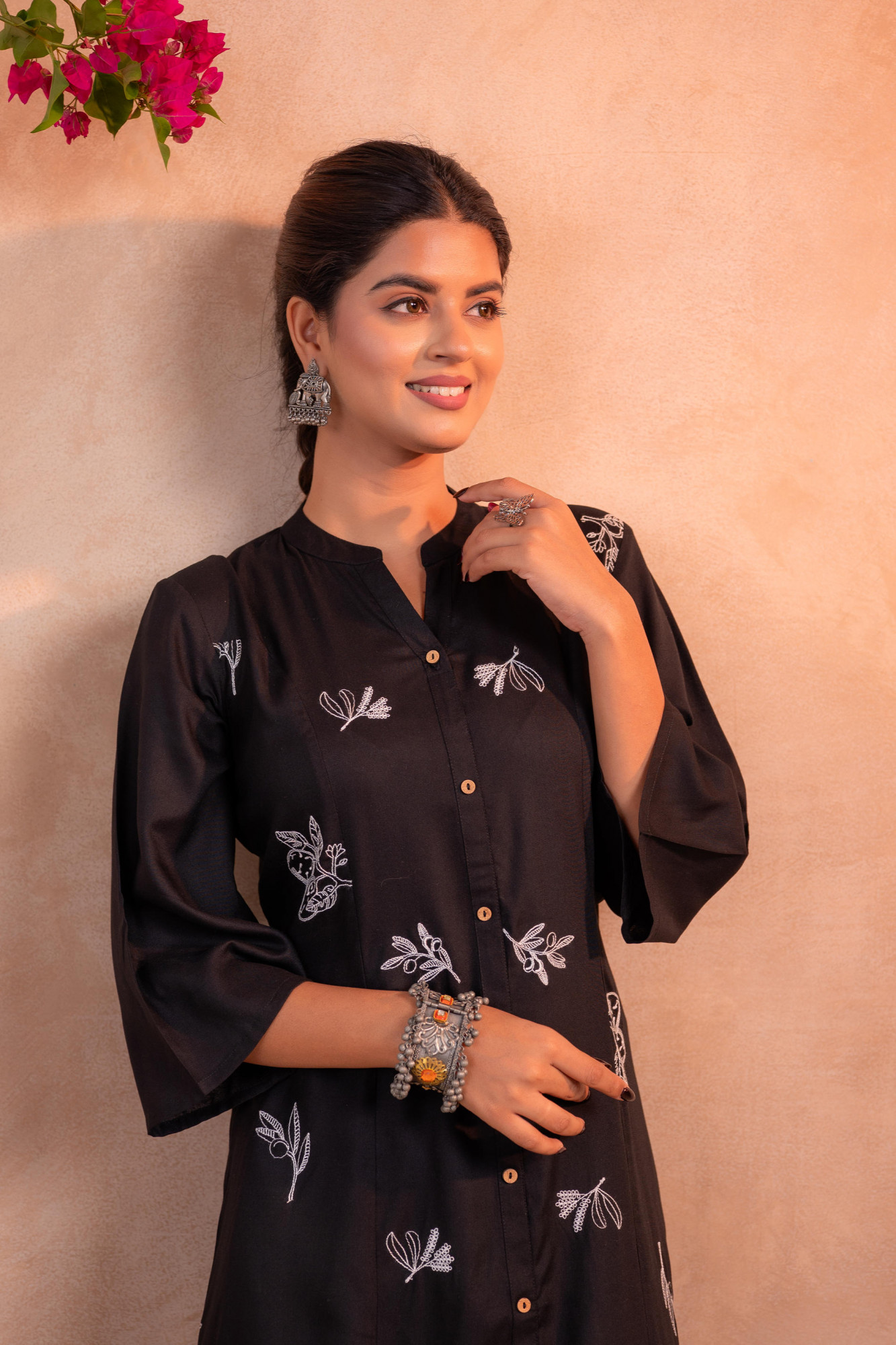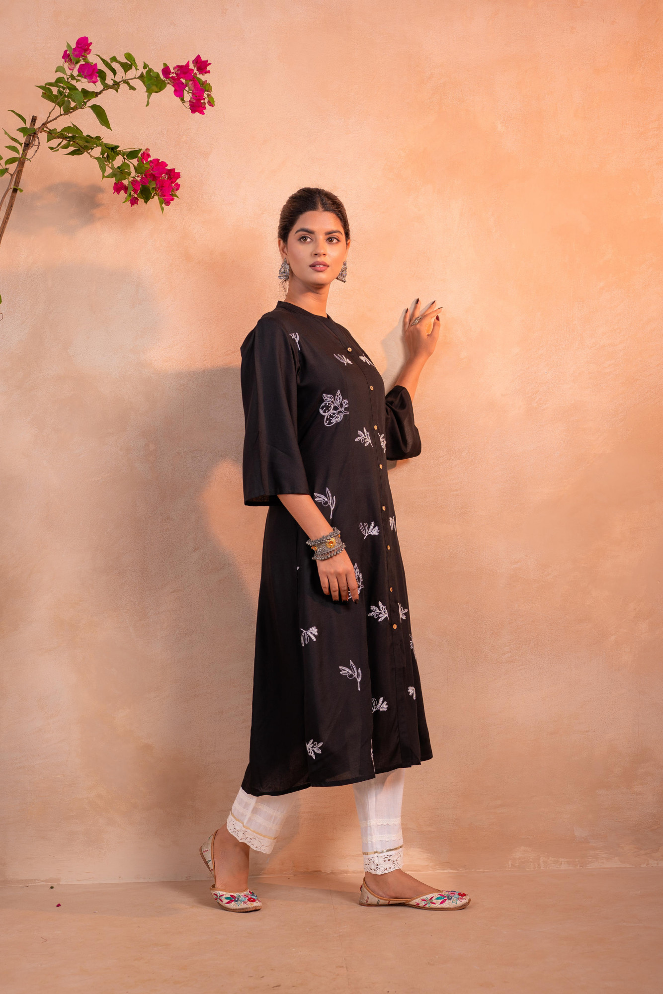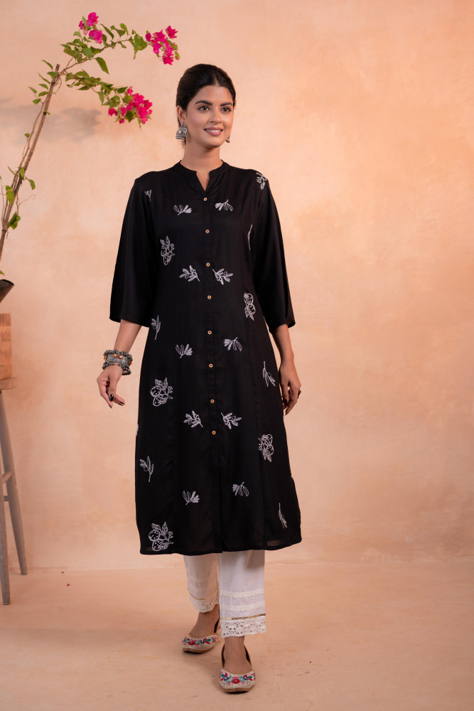 A timeless straight-fit kurta adorned with delicate scattered floral motifs. Designed with a clean mandarin collar and front button-down detailing, this piece blends minimal elegance with everyday sophistication. Perfect for effortless office wear or refined day outings.Pack of Content :- 1 KURTATop Type :- Kurta Top Pattern :- Embroidered Print Type :- Floral Top Fabric :- Viscose Top Design Styling :- Straight-cut button-down kurta Top Hemline :- Straight Top Length :- Calf length Top Shape :- Straight Neck :- Mandarin Sleeve Length :- Three-quarter sleeves Top Closure :- Full front button-down placket >Ornamentation :- Buttons