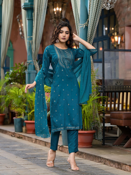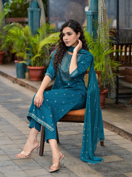 Blue ethnic motif printed muslin kurta set, adorned with intricate Zari work and elegant gota patti detailing. The knee-length, straight kurta features a round neckline and three-quarter sleeves, paired with solid slip-on pants and a dupatta embellished with Zari work and gota patti accents for a touch of traditional elegance.