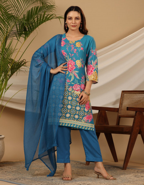 The Digitopia blue rayon printed kurta set. Regular fit, straight silhouette, calf length, round neck, side slits, slip-on style. Includes rayon pants, solid with partially elasticated waist, adorned with sequins for a touch of sparklePack of Content :- 1 Kurta, 1 Pants, 1 Dupatta Top Type :- Kurta Top Pattern :- Printed Print Type :- Floral Top Fabric :- Rayon Top Design Styling :- Regular Top Length :- Calf Length Top Shape :- Straight Neck :- Round Neck Sleeve Length :- Three Quarter Sleeves Sleeve Styling :- Regular Sleeves Top Closure :- Slip-On Bottom Fabric :- Pants Bottom Type :- Pants Bottom Pattern :- Solid Bottom Closure :- Slip-On Waistband :- Partially Elasticated Occasion :- Daily Ornamentation :- Sequined Dupatta(Yes, No) :- Yes Dupatta Fabric :- Chiffon Dupatta Pattern :- Solid Number of Pockets :- 1