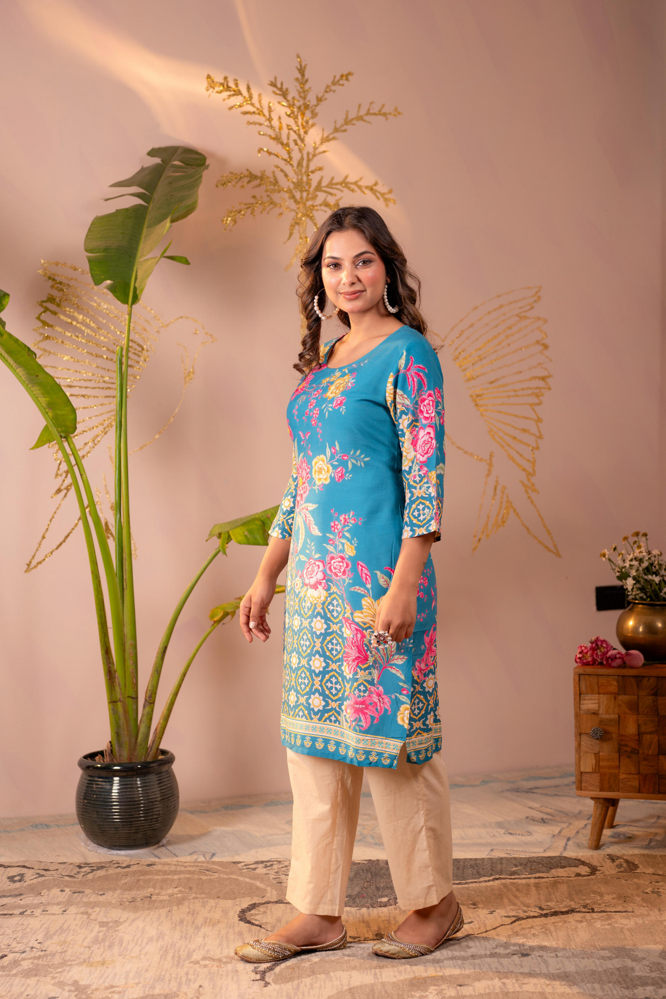 This elegant blue straight kurta features vibrant floral and Mughal-inspired motifs arranged in a harmonious all-over print. Designed with a round neckline and three-quarter sleeves, the kurta blends traditional artistry with modern wearability. The richly patterned hem panel adds visual depth, making it ideal for both casual festivities and refined daywear.