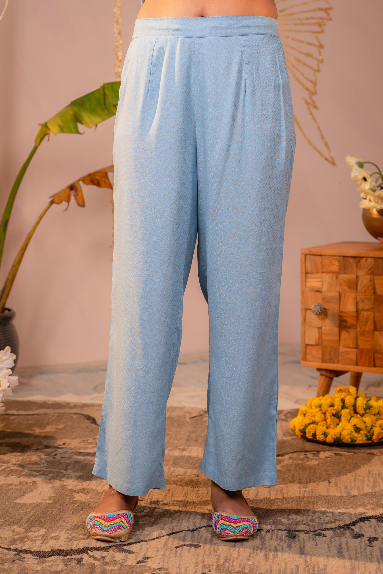 A calm and contemporary powder blue co-ord set designed for effortless day wear. Featuring delicate tonal embroidery on a relaxed kurta-style top paired with straight-fit pants, this ensemble blends minimal elegance with all-day comfort—perfect for modern ethnic wardrobes.Top Type :- Tops Dupatta(Yes, No) :- No Top Pattern :- Embroidered Print Type :- Floral Top Fabric :- Viscose Top Design Styling :- Straight Short Kurta Top Hemline :- High–low Top Length :- Mid-thigh length Top Shape :- Straight Neck :- Round neckline with short front placket Sleeve Length :- Three-quarter sleeves Sleeve Styling :- Bell sleeves Bottom Type :- Pant Bottom Fabric :- Viscose Bottom Pattern :- Solid Ornamentation :- Buttons,Threads,Sequins