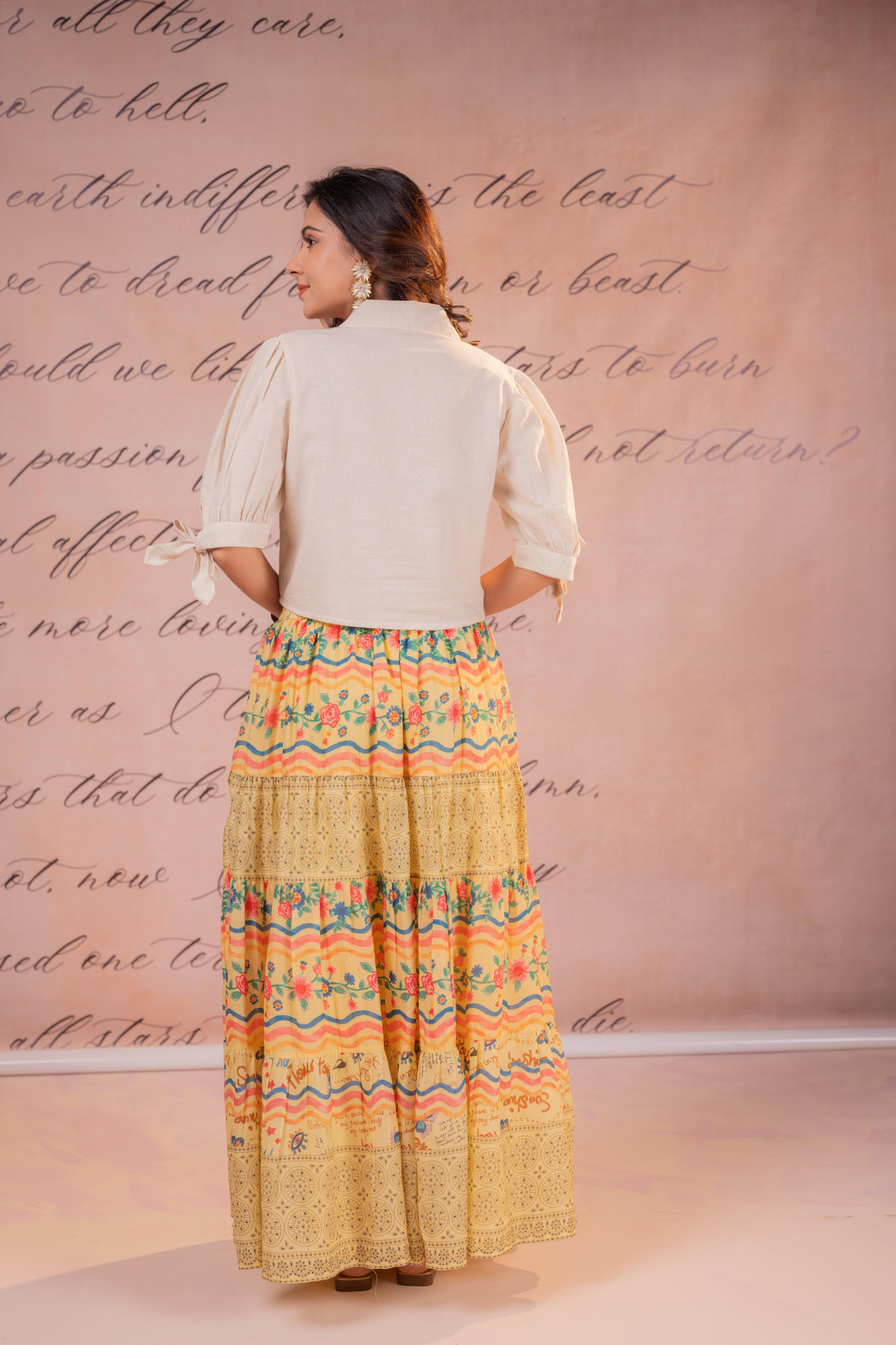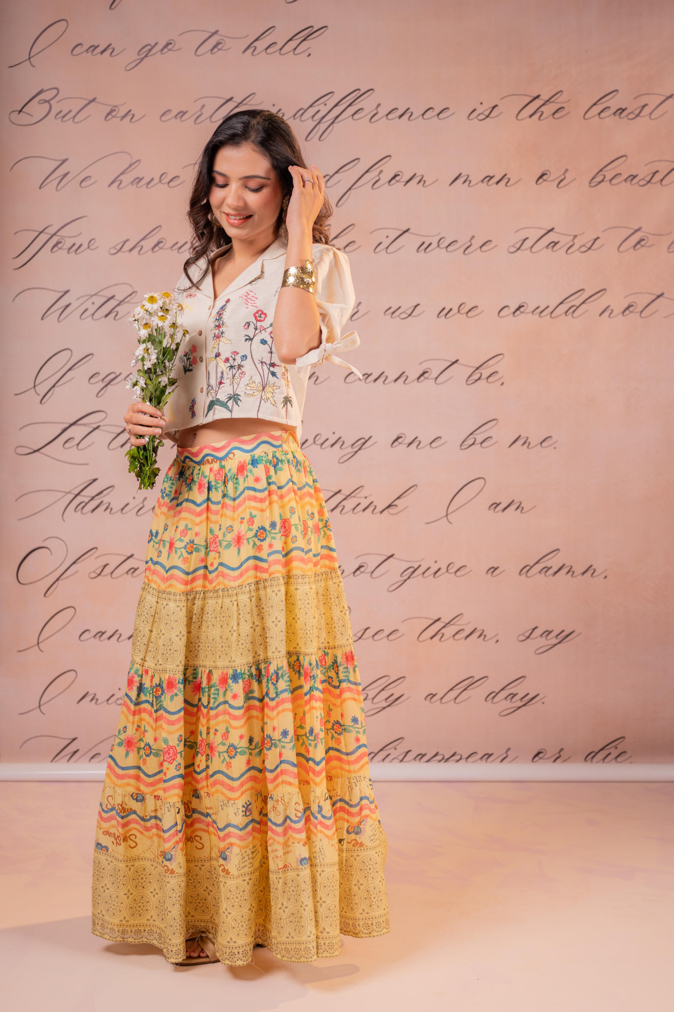 A breezy boho-inspired co-ord set featuring a delicately embroidered top paired with a multi-tiered printed maxi skirt. The ensemble reflects artisanal charm through intricate threadwork and folk-inspired patterns, making it perfect for relaxed yet statement summer dressing.Pack of Content :- 1 Top, 1 Skirt Top Type :- Tops Top Pattern :- Embroidered Print/Pattern Type/Trend :- Floral Top Fabric :- Viscose Top Design Styling :- Crop shirt style top Top Hemline :- Slight curved Top Length :- Above Waist Top Shape :- Straight Neck :- V-Neck Collared Sleeve Length :- Elbow length Top Closure :- Front button-down Bottom Fabric :- Cotton Bottom Type :- Skirt Occasion :- Casual Ornamentation :- Buttons,ThreadsFit :- Fit & Flare