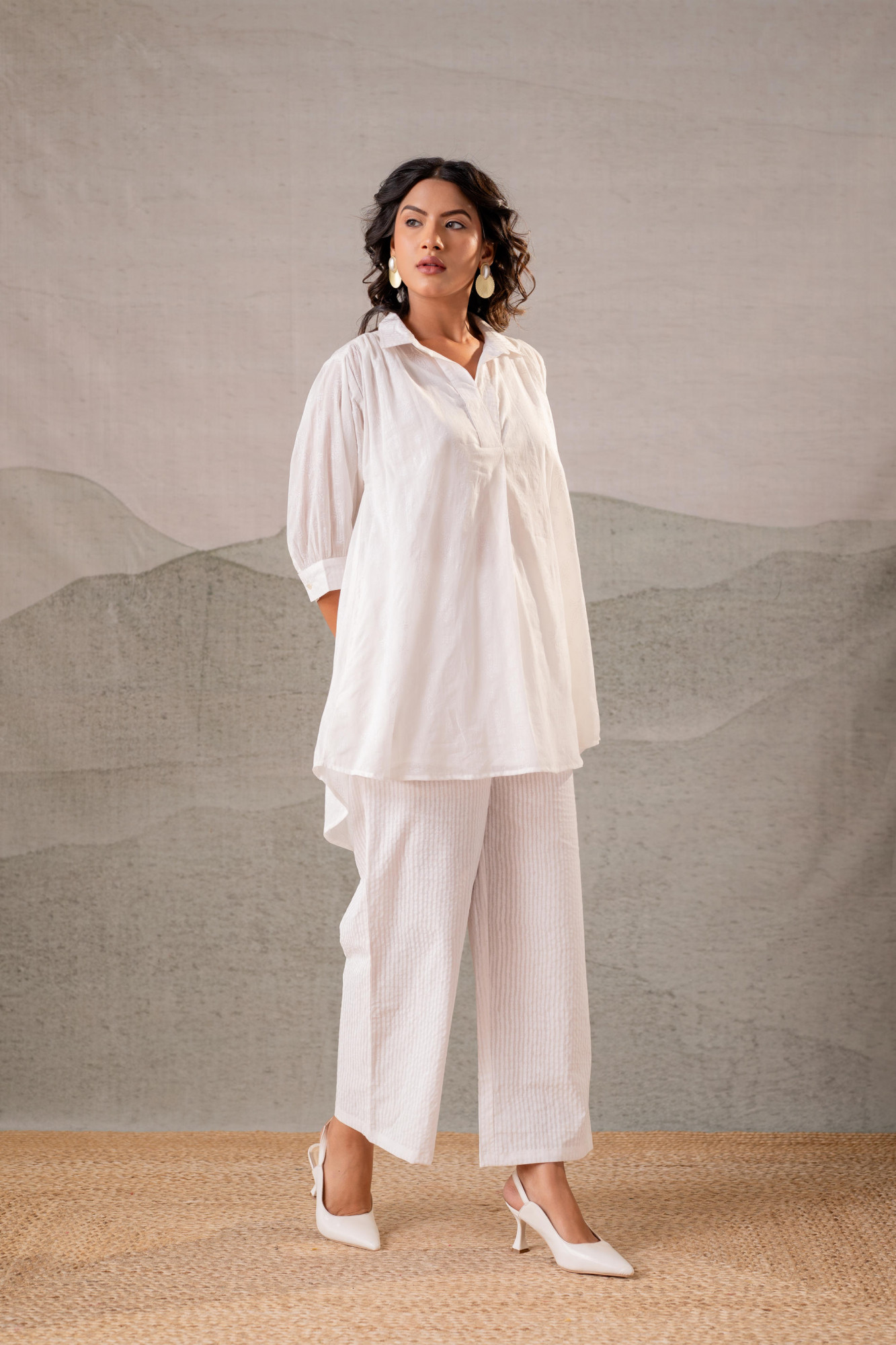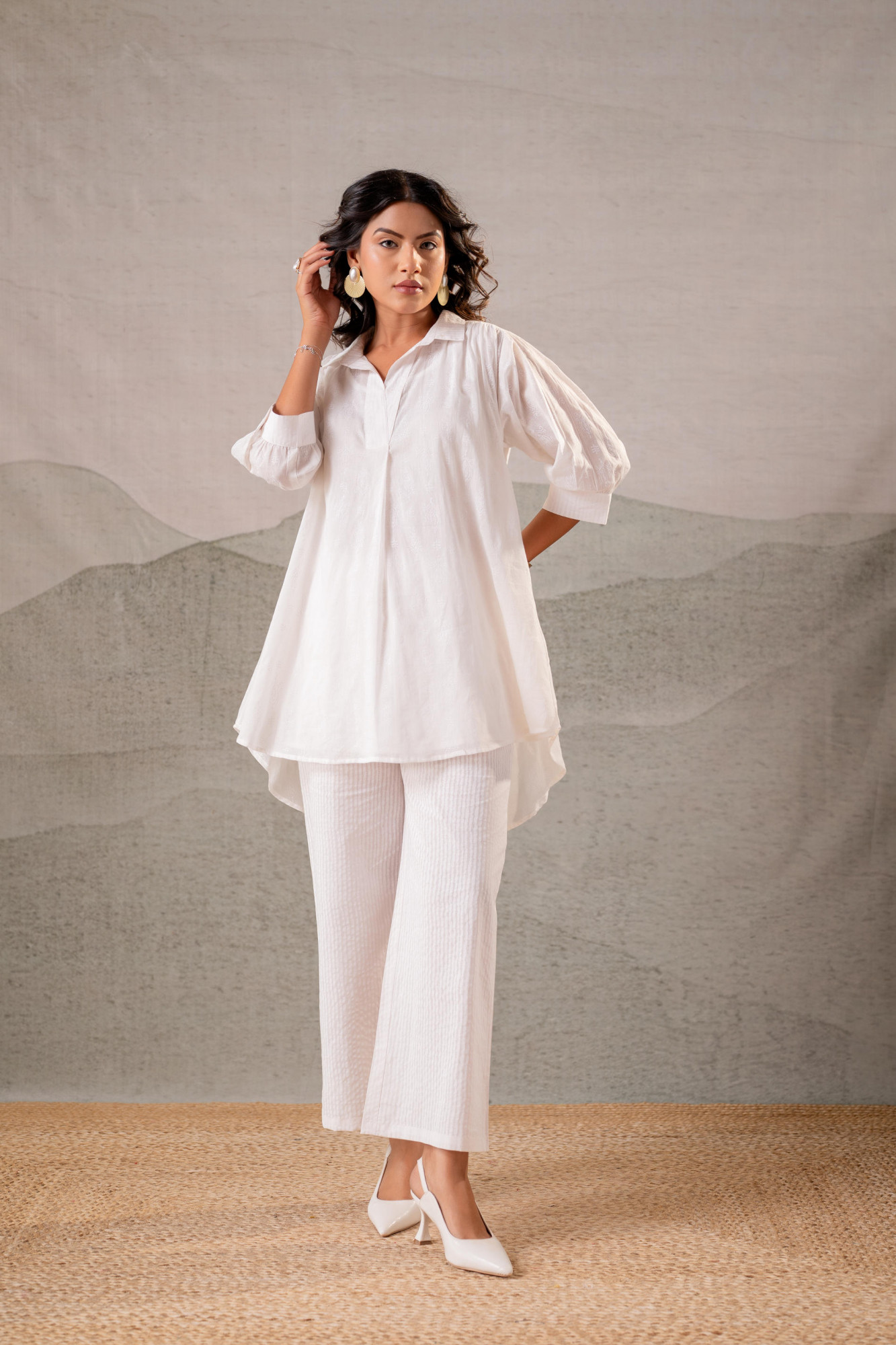 An effortless white co-ord set designed for comfort-led elegance. Featuring a relaxed tunic-style top with subtle all-over motifs and striped straight pants, this ensemble blends minimal prints with breathable silhouettes—perfect for everyday sophistication and summer-ready styling.Top Type :- Tunic Dupatta(Yes, No) :- No Top Pattern :- Printed Print Type :- Abstract Top Fabric :- Cotton Top Design Styling :- A-Line Short Kurta Top Hemline :- High–low Top Length :- Hip to mid-thigh length Top Shape :- A-Line Neck :- Shirt collar Sleeve Length :- Three-quarter sleeves Sleeve Styling :- Soft puff Bottom Type :- Pant Bottom Fabric :- Cotton Bottom Pattern :- Printed Ornamentation :- NA