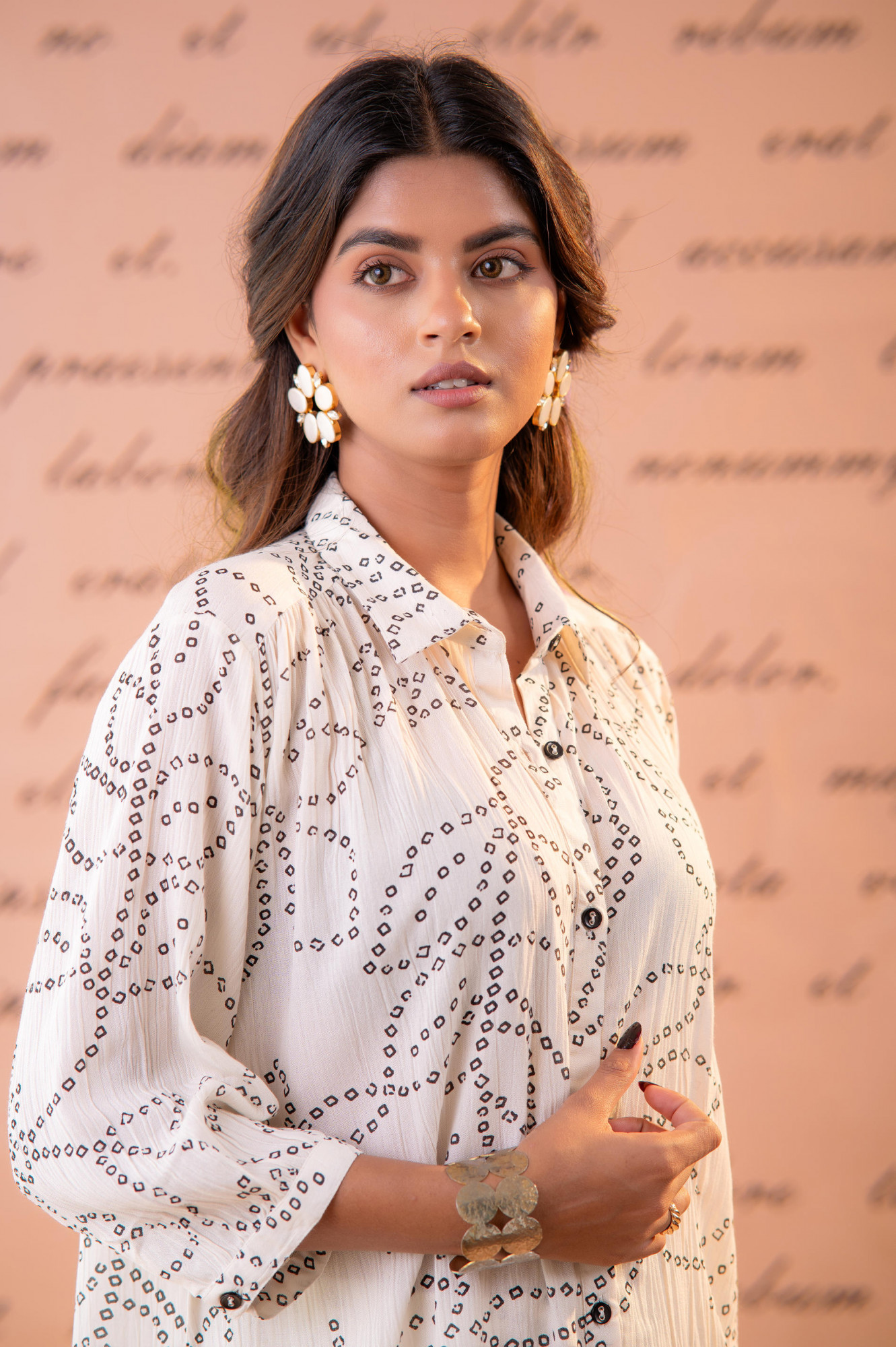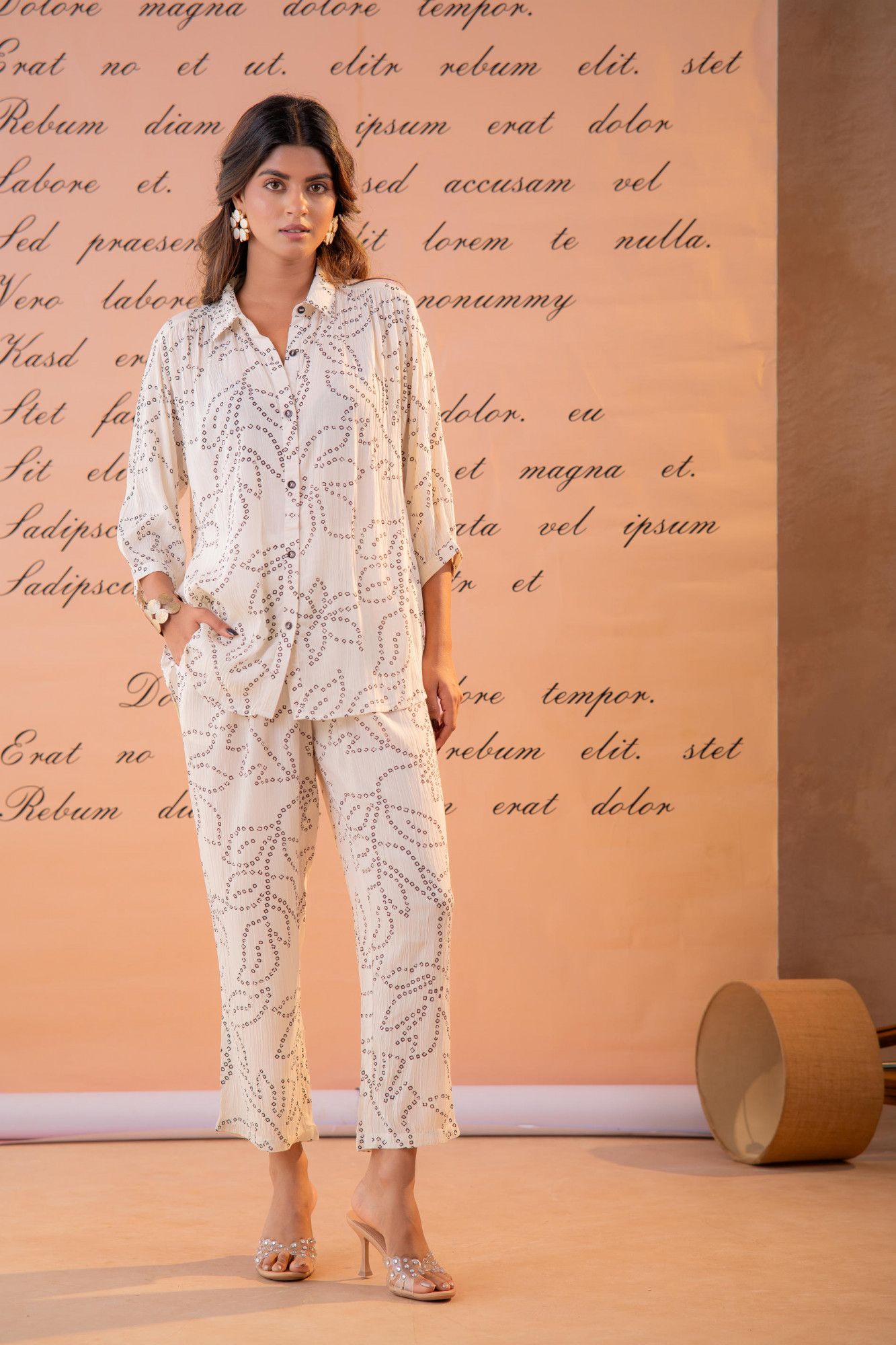 A relaxed white co-ord set featuring an abstract dotted print inspired by hand-crafted resist techniques. Designed with a soft shirt-style tunic and straight pants, this ensemble offers effortless comfort with a contemporary artisanal feel—perfect for elevated everyday wear.Top Type :- Tunic Dupatta(Yes, No) :- No Top Pattern :- Printed Print Type :- Abstract Top Fabric :- Viscose Top Design Styling :- Straight Relaxed Shirt Top Hemline :- Straight Top Length :- Hip length Top Shape :- Straight Neck :- Shirt collar Sleeve Length :- Three-quarter sleeves Sleeve Styling :- Regular with soft cuff Bottom Type :- Pant Bottom Fabric :- Viscose Bottom Pattern :- Printed Ornamentation :- Buttons