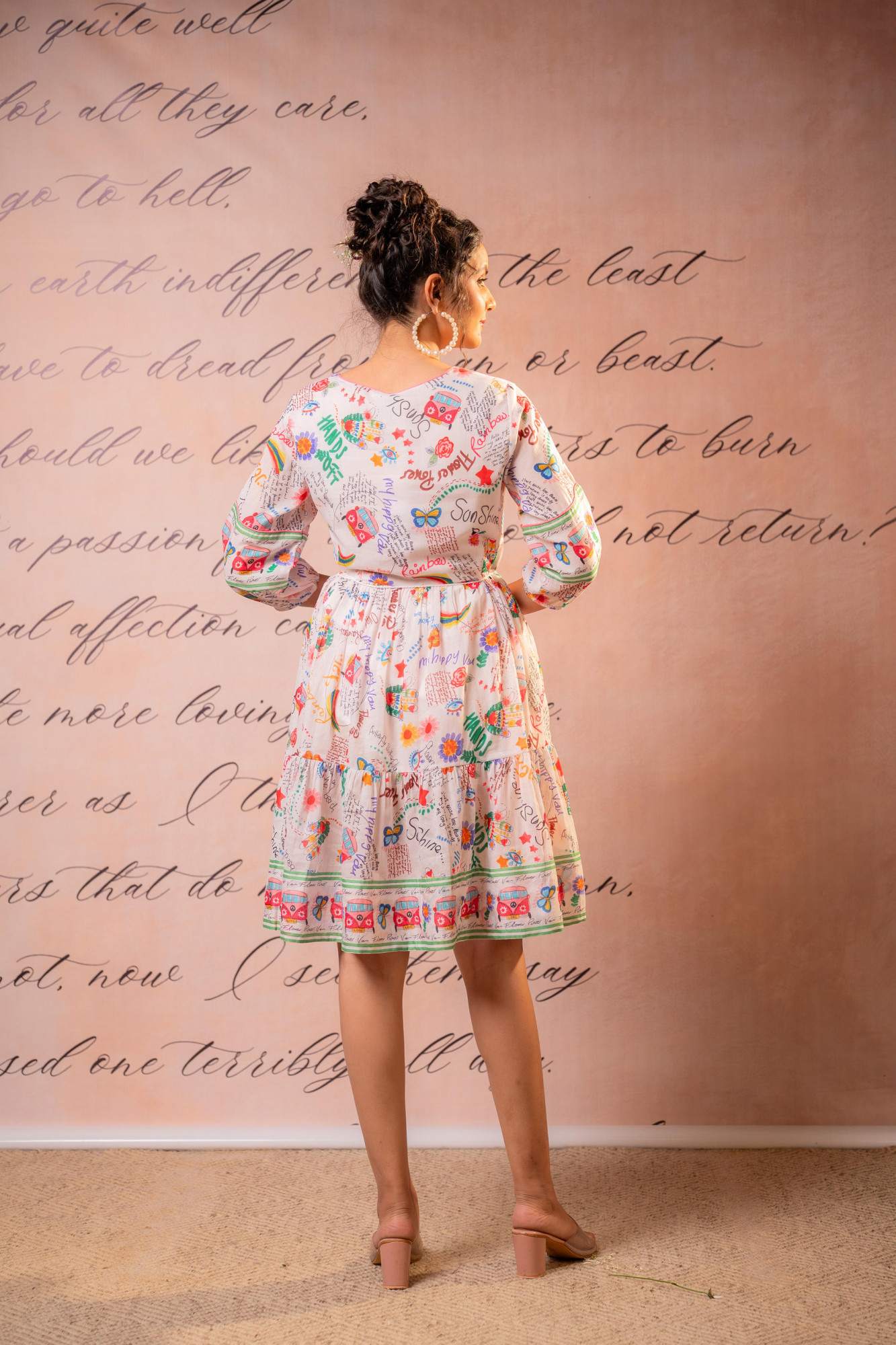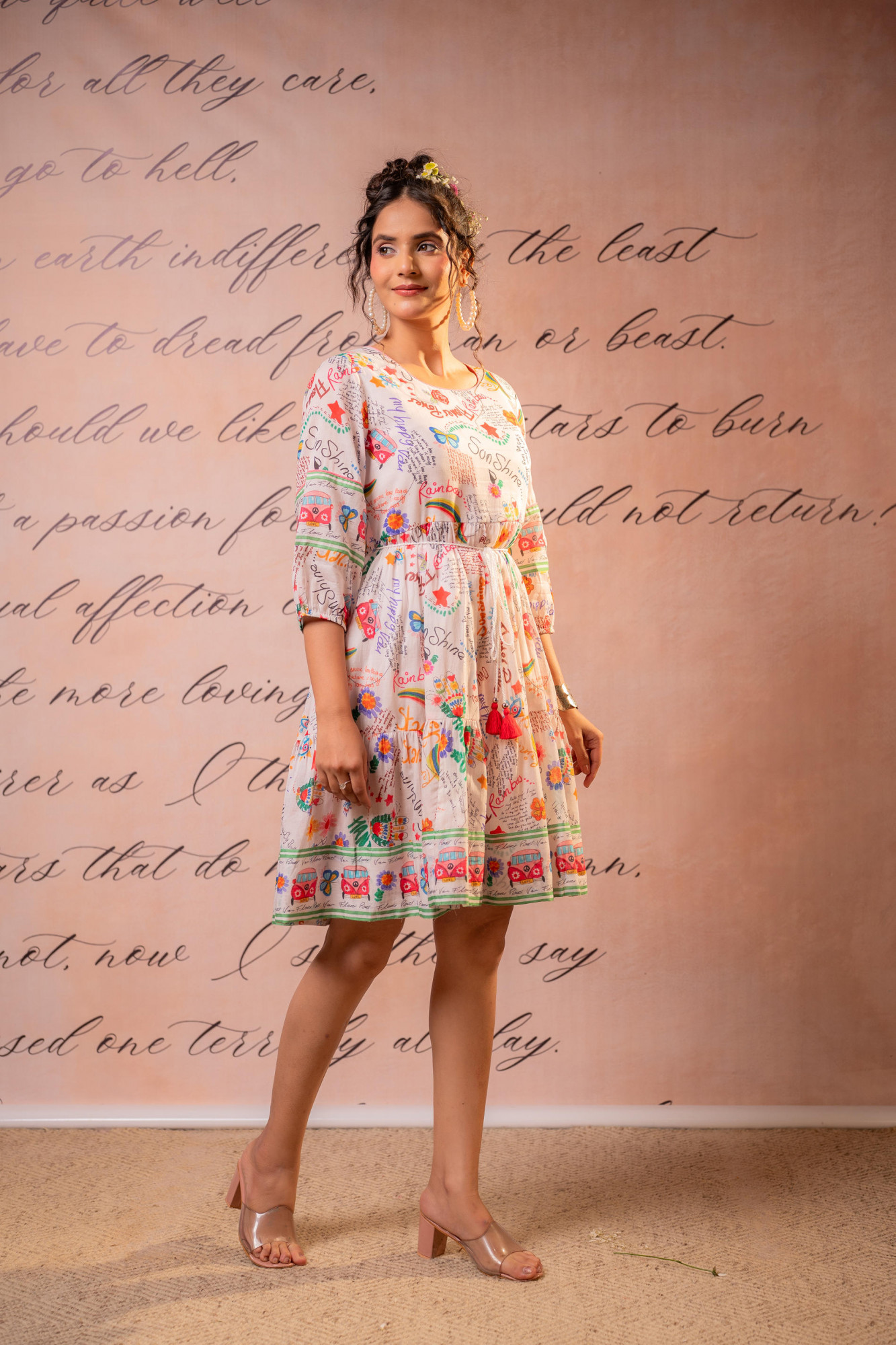 A graceful cream base dress adorned with vibrant multicolor floral prints and intricate border detailing. Designed with a soft flared silhouette and highlighted with playful tassel accents, this dress captures a breezy bohemian charm. The gathered waist enhances structure while maintaining flow, making it ideal for daytime festivities and casual celebrations.Pack of Content :- 1 SHORTDRESS, 1 DORITop Type :- Dress Top Pattern :- Printed Print Type :- Floral Top Fabric :- Cotton Top Design Styling :- A-line midi dress Top Hemline :- Flared Top Length :- Above Knee Top Shape :- A-line Neck :- Round neck Sleeve Length :- Three-quarter sleeves Top Closure :- Slip-on >Ornamentation :- Dori, Tassels
