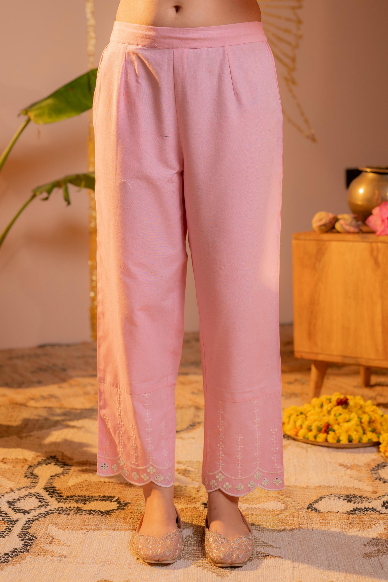 A serene pink and off-white kurta set featuring delicate embroidery on the yoke and subtle border detailing. Paired with matching straight pants and a soft sheer dupatta, this outfit offers graceful sophistication perfect for daytime festive occasions.Top Type :- Kurta Dupatta(Yes, No) :- Yes Top Pattern :- Embroidered Print Type :- Ethnic Top Fabric :- Man Made Fiber Top Design Styling :- A-Line gathered kurta Top Hemline :- Flared scalloped Top Length :- Knee Length Top Shape :- A-line Neck :- Round neck with V-notch Sleeve Length :- Three-quarter sleeves Top Closure :- Slip-on Bottom Type :- Pant Bottom Fabric :- Man Made Fiber Bottom Pattern :- Embroidered Ornamentation :- Threads Dupatta Fabric :- Man Made Fiber