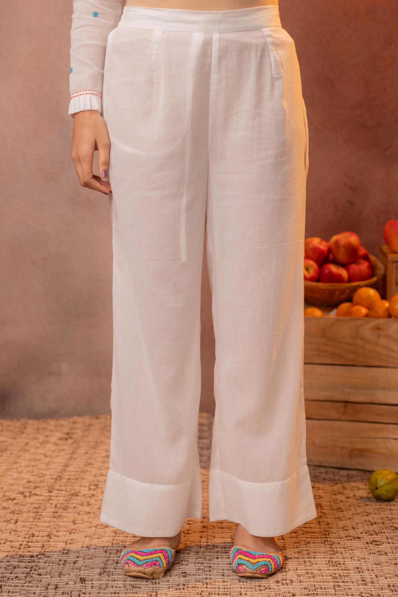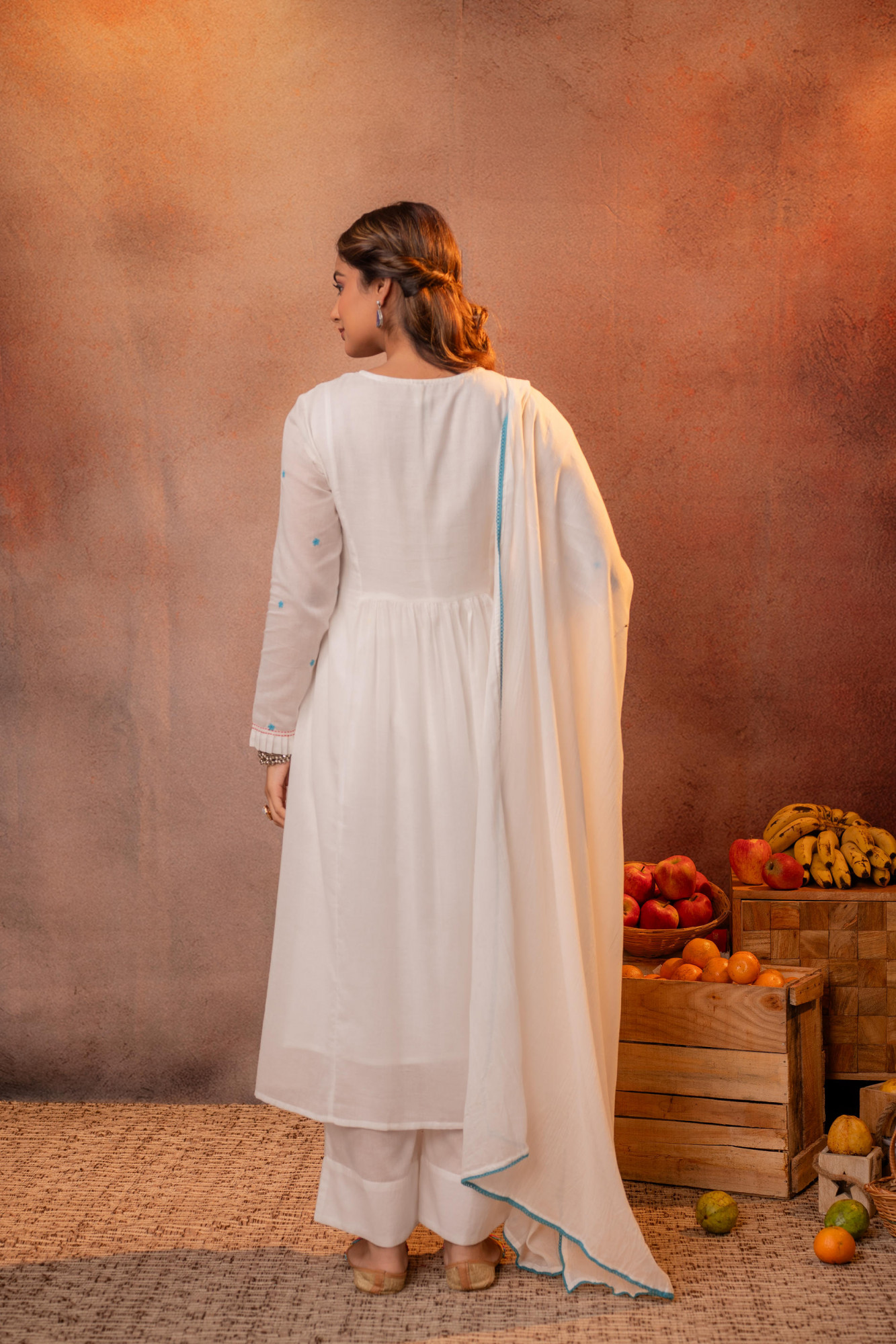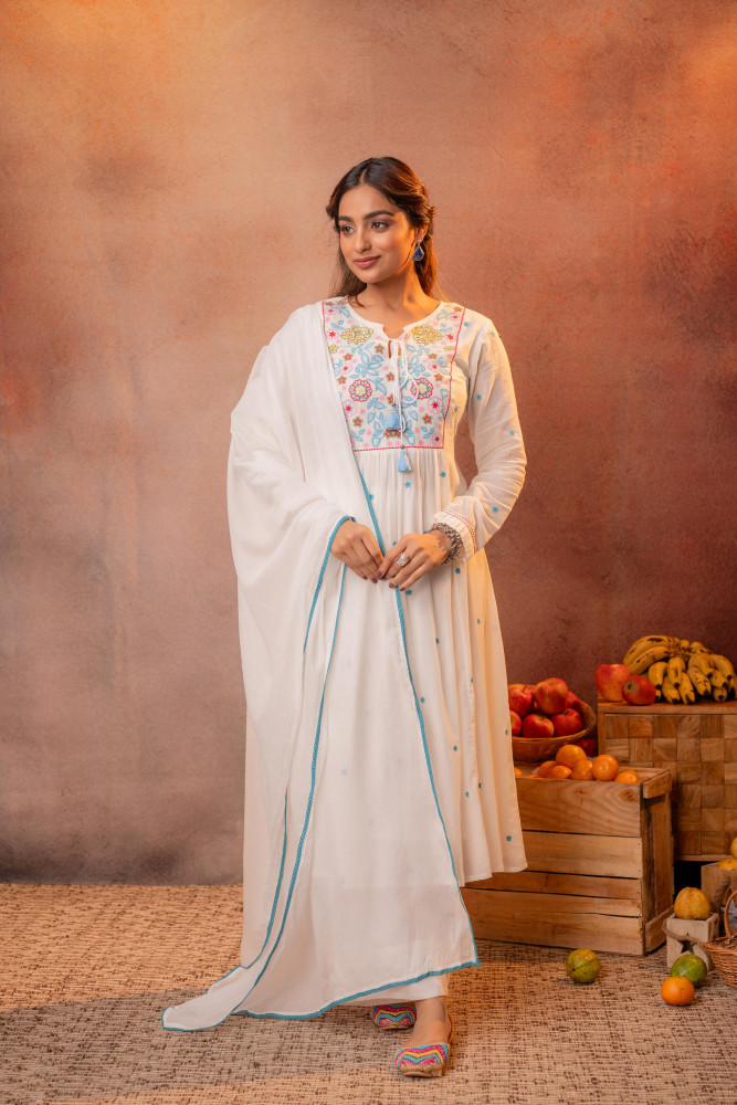 A soft and graceful white kurta set featuring delicate embroidered yoke detailing and subtle buti motifs across the fabric. Paired with matching straight pants and a flowy dupatta, this ensemble reflects understated festive elegance with a contemporary ethnic touch.Top Type :- Kurta Dupatta(Yes, No) :- Yes Top Pattern :- Embroidered Print Type :- Floral Top Fabric :- Cotton Top Design Styling :- A-Line gathered kurta Top Hemline :- Flared Top Length :- Knee Length Top Shape :- A-line Neck :- Round neck with V-notch Sleeve Length :- Full Top Closure :- Slip-on Bottom Type :- Pant Bottom Fabric :- Cotton Bottom Pattern :- Solid Ornamentation :- Dori, Tassels ,Lace , Threads Dupatta Fabric :- Cotton