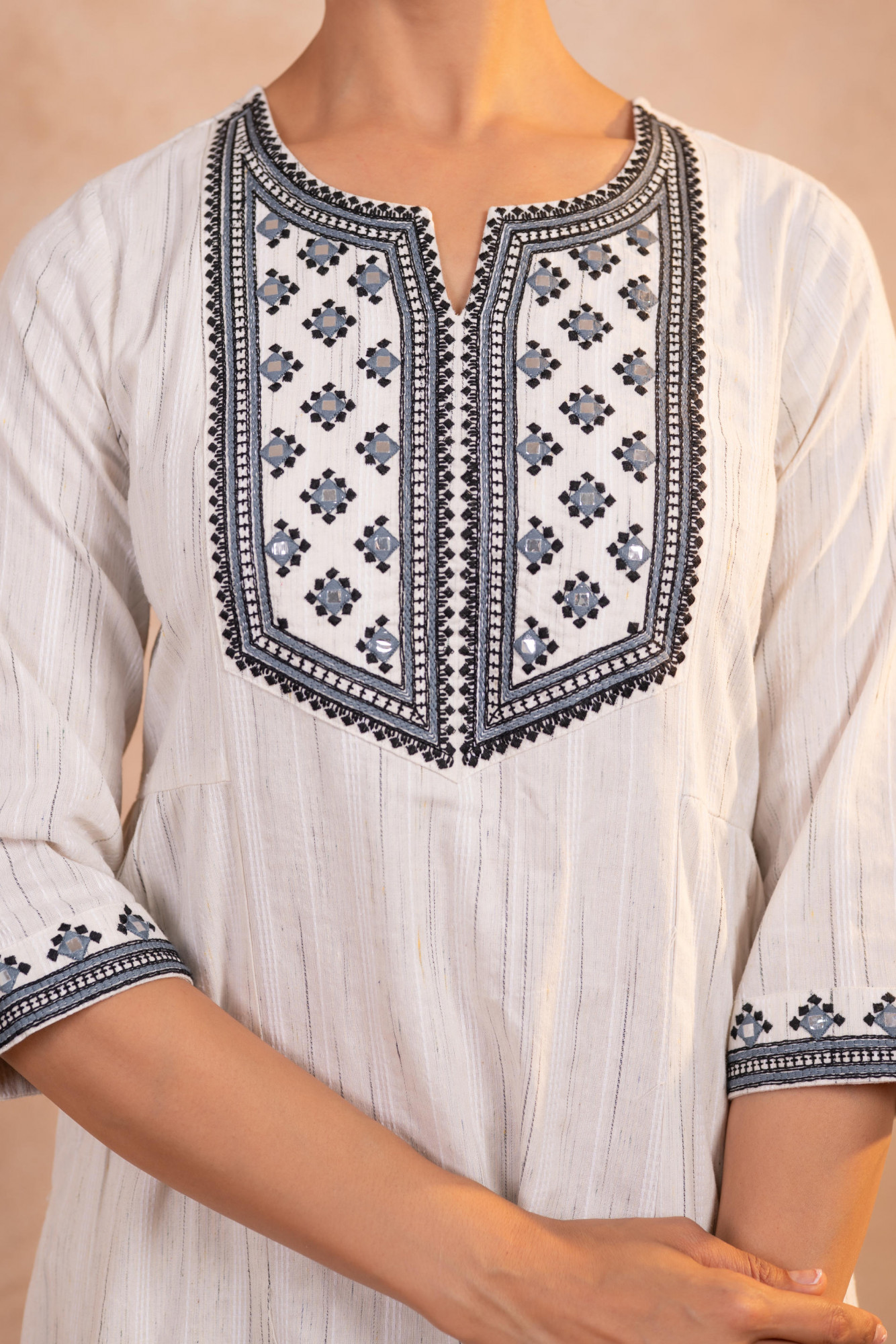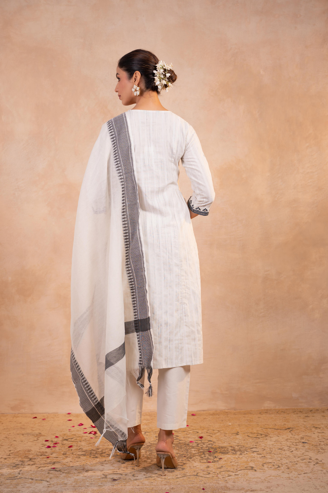 A crisp white kurta paired with white pants and an off‑white dupatta, featuring intricate black embroidered detailing on the neckline and sleeve edges, perfect for casual‑formal occasions.Top Type :- Kurta Dupatta(Yes, No) :- Yes Top Pattern :- Embroidered Print Type :- Floral Top Fabric :- Poly Cotton Top Design Styling :- Straight Kurta Top Hemline :- Straight Top Length :- Knee Length Top Shape :- Straight Neck :- Round neck with V-notch Sleeve Length :- Three-quarter sleeves Top Closure :- Slip-on Bottom Type :- Pant Bottom Fabric :- Poly Cotton Bottom Pattern :- Solid Ornamentation :- Threads,Lace Dupatta Fabric :- Poly Cotton