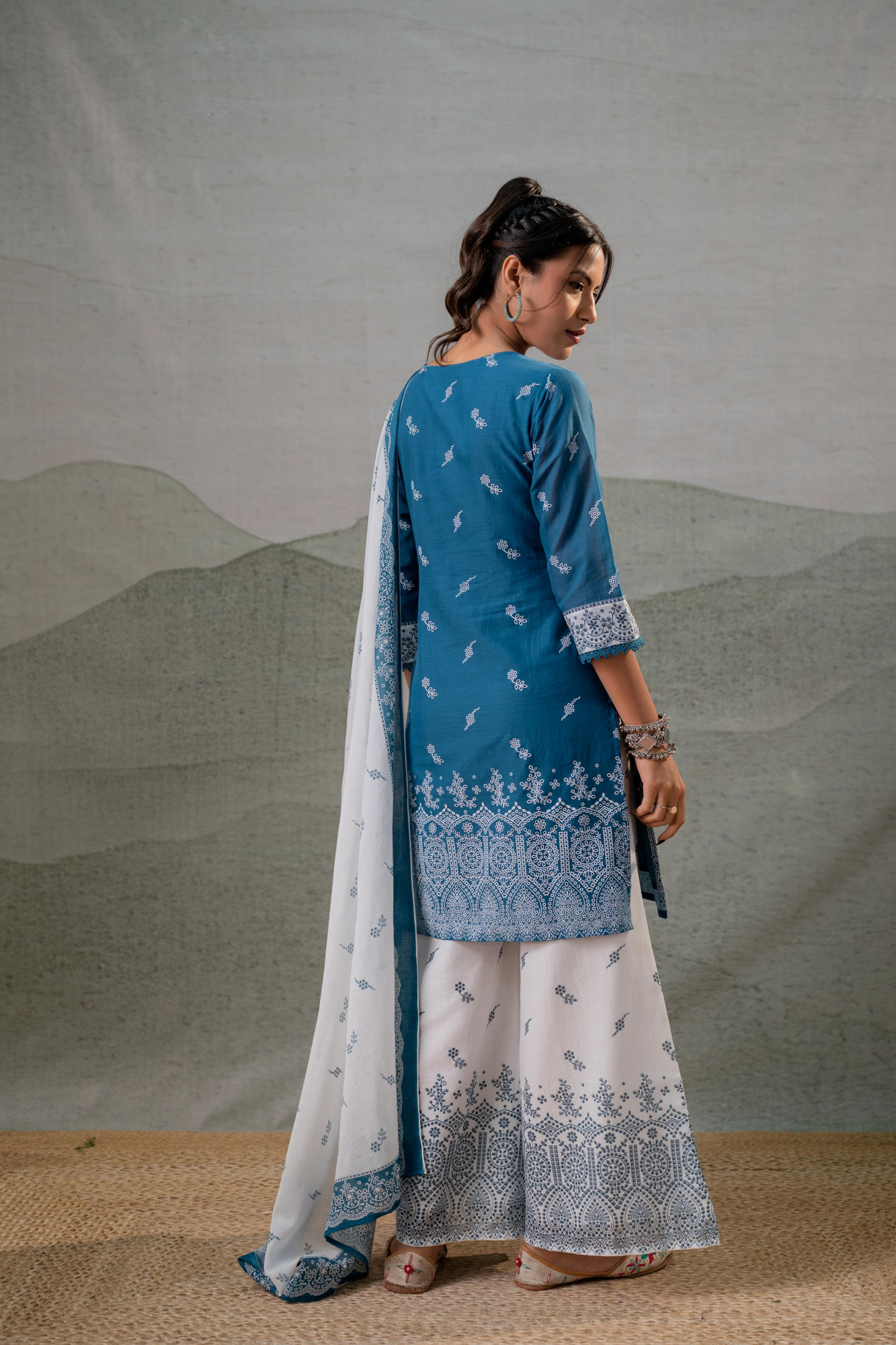 A stylish blue straight short kurta paired with white palazzo pants and a contrasting white dupatta with blue border, perfect for festive or casual ethnic wear.Top Type :- Kurta Dupatta(Yes, No) :- Yes Top Pattern :- Printed Print Type :- Ethnic Top Fabric :- Cotton Top Design Styling :- Short Straight Kurta Top Hemline :- Straight Top Length :- Above Knee Top Shape :- Straight Neck :- Round neck with V-notch Sleeve Length :- Three-quarter sleeves Top Closure :- Slip-on Bottom Type :- Palazzo Bottom Fabric :- Cotton Bottom Pattern :- Printed Ornamentation :- Lace Dupatta Fabric :- Cotton
