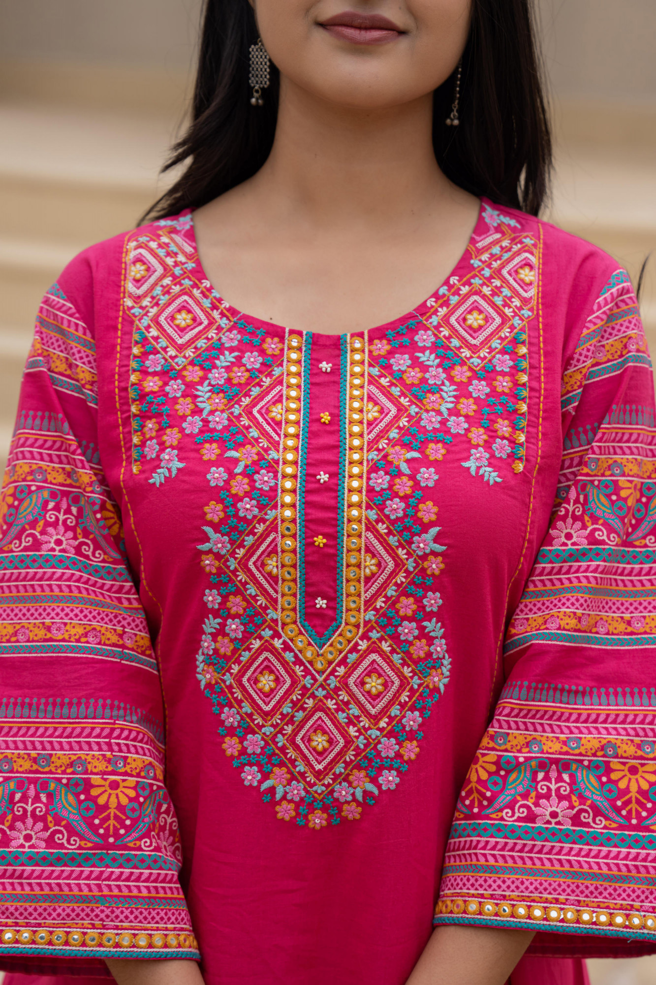 Fuchsia floral printed cotton kurta set features exquisite thread and mirror work. The straight kurta with a round neckline and three-quarter regular sleeves is paired with printed slip-on pants and a matching printed dupatta for a stylish, coordinated look.
