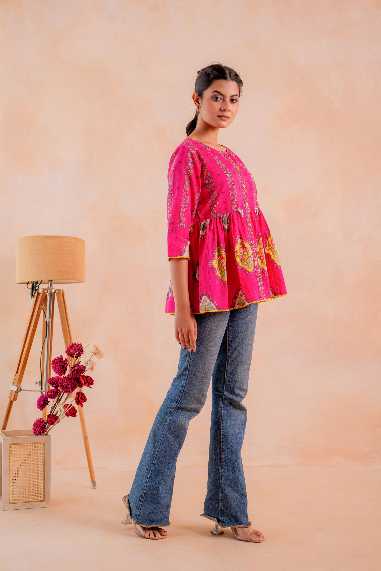 This vibrant fuchsia ethnic tunic showcases traditional floral and geometric motifs in an all-over print. Designed with a gathered waist and flared silhouette, it offers a graceful fall and comfortable wear. The round neckline with a button placket adds classic charm, making it perfect for everyday ethnic styling and casual festive occasions.Pack of Content Each Size Set:- 1 TUNIC Top Type :- Tunic Top Pattern :- Printed Print Type :- Floral Top Fabric :- Cotton Top Design Styling :- A-line Short Kurta Top Hemline :- Flared Top Length :- Mid-thigh length Top Shape :- A-line Neck :- Round neck Sleeve Length :- Three-quarter sleeves Sleeve Styling :- Regular Top Closure :- Button placket (front) Occasion :- Casual Ornamentation :- Buttons