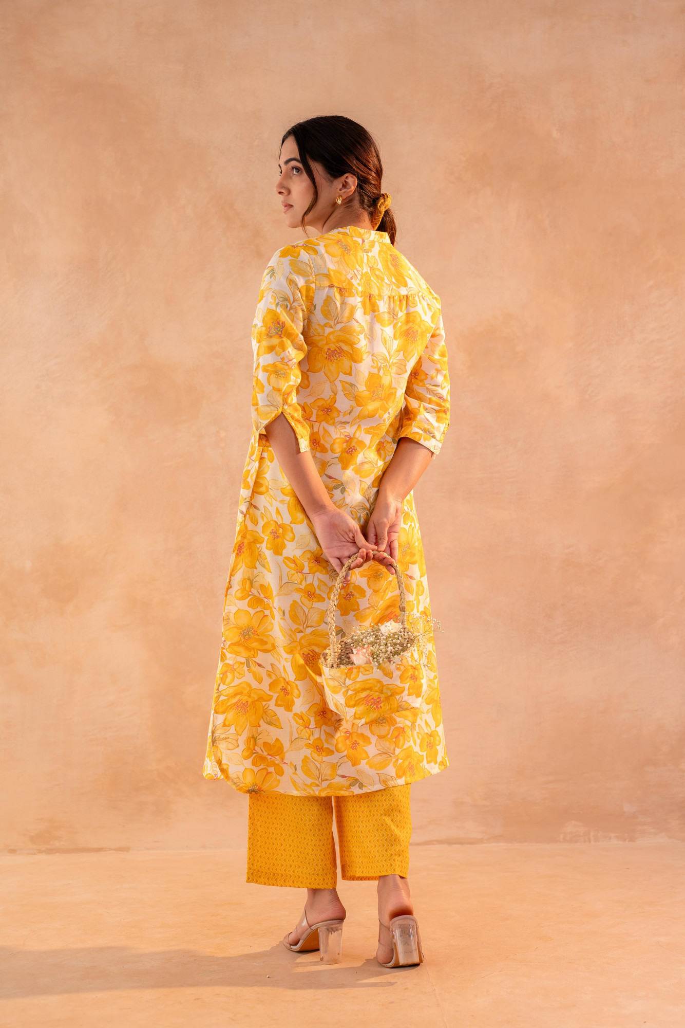 A fresh and cheerful yellow kurta set adorned with soft ivory floral prints, paired with textured straight pants. Designed for effortless daytime elegance, this set blends comfort with a timeless ethnic charm.Pack of Content Each Size Set:- 1 KURTA, 1 PANT Top Type :- Kurta Top Pattern :- Printed Print Type :- Floral Top Fabric :- Man Made Fiber Top Design Styling :- Straight Kurta Top Hemline :- Straight Top Length :- Calf length Top Shape :- Straight Neck :- Mandarin collar Sleeve Length :- Three-quarter sleeves Sleeve Styling :- Regular Top Closure :- Front button placket Bottom Type :- Pant Bottom Fabric :- Man Made Fiber Bottom Pattern :- Printed Waistband :- Partially elasticated Occasion :- Casual Ornamentation :- Buttons