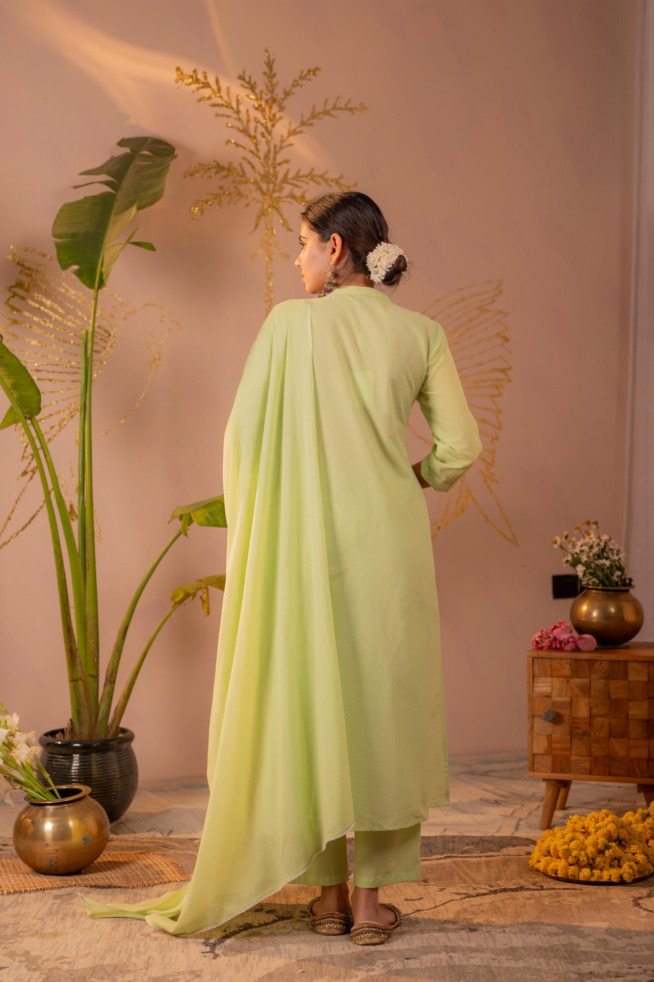 An elegant green kurta set designed with delicate white floral embroidery along the hem and subtle pintuck detailing on the front. Paired with straight pants and a matching dupatta, this outfit blends sophistication with minimal festive charm, making it perfect for daytime traditional occasions and refined ethnic stylingTop Type :- Kurta Dupatta(Yes, No) :- Yes Top Pattern :- Embroidered Print Type :- Floral Top Fabric :- Cotton Top Design Styling :- Straight Kurta Top Hemline :- Scalloped Top Length :- Calf length Top Shape :- Straight Neck :- Mandarin collar Sleeve Length :- Three-quarter sleeves Top Closure :- Front button placket Bottom Type :- Pant Bottom Fabric :- Cotton Bottom Pattern :- Solid Ornamentation :- Buttons,Threads Dupatta Fabric :- Cotton