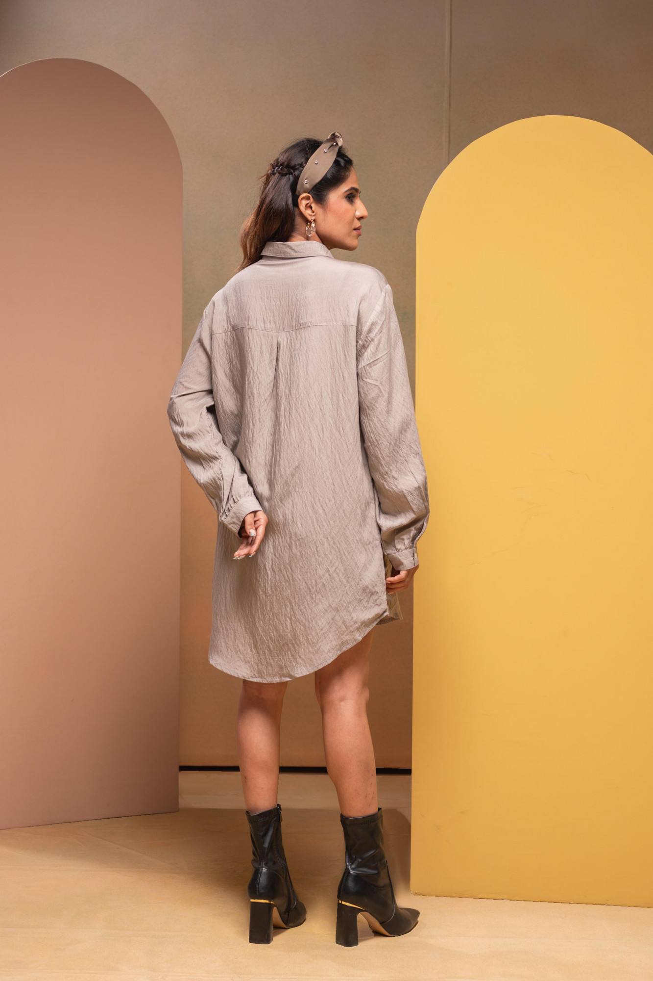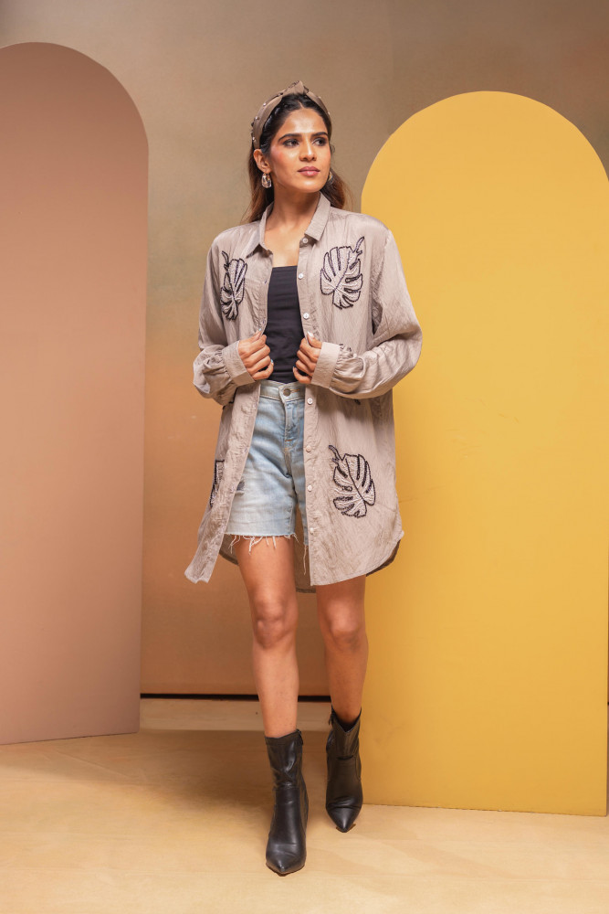 This casual Grey viscose shirt features a straight fit with a curved hem, shirt collar, full cuff sleeves, and button closure. It is elegantly embellished with beads, crafted for a comfortable regular fit perfect for everyday styling.Each Size of Content :- 1 Shirt Top Type :- 1 Shirt Top Pattern :- Embellished Print Type :- Solid Top Fabric :- Viscose Top Design Styling :- Straight Top Hemline :- Curved Top Length :- Hip Length Top Shape :- Straight Neck :- Shirt Coller Sleeve Length :- Full Sleeve Sleeve Styling :- Cuff Sleeve Top Closure :- Button Ornamentation :- Beads Fit :- Regular