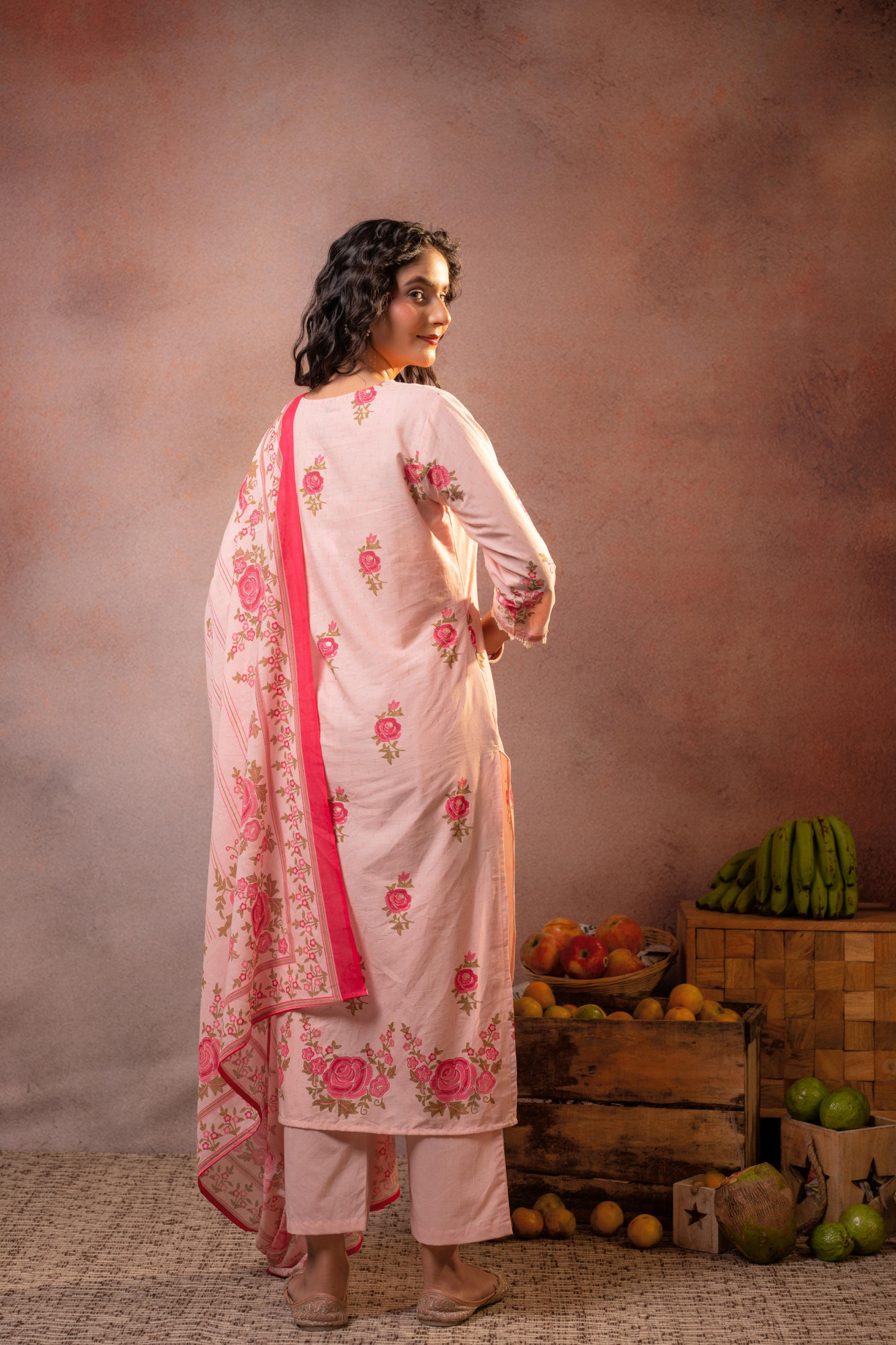 A romantic blush Pink kurta set adorned with delicate rose floral motifs, paired with straight pants and a contrast-bordered dupatta. The soft pastel tones and timeless floral print lend an effortlessly elegant charm, perfect for graceful daytime festivities.Pack of Content Each Size Set:- 1 KURTA, 1 PANT, 1 DUPATTA Top Type :- Kurta Dupatta(Yes, No) :- Yes Top Pattern :- Printed Print Type :- Floral Top Fabric :- Cotton Top Design Styling :- Straight Kurta Top Hemline :- Straight Top Length :- Calf length Top Shape :- Straight Neck :- V-neck Sleeve Length :- Three-quarter sleeves Sleeve Styling :- Regular Top Closure :- Slip-on Bottom Type :- Pant Bottom Fabric :- Cotton Bottom Pattern :- Solid Waistband :- Partially elasticated Occasion :- Semi-Festive Ornamentation :- Lace Dupatta Fabric :- Cotton Dupatta Pattern :- Printed