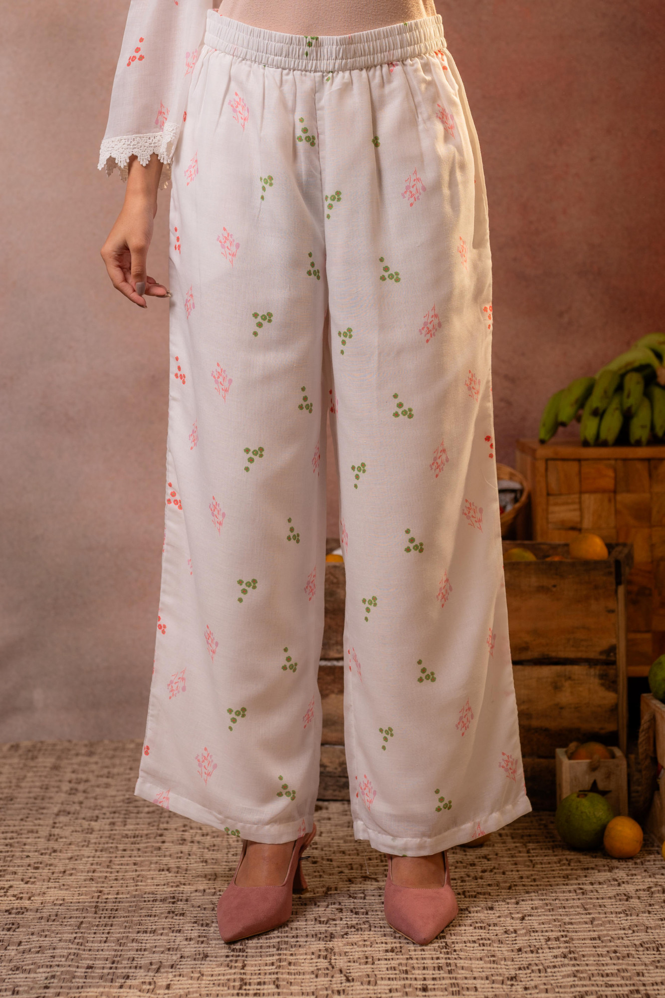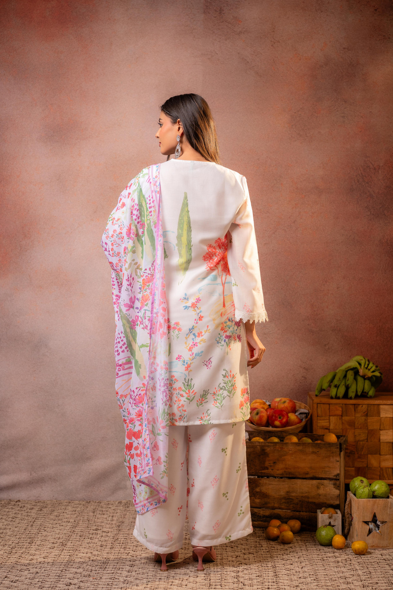 An airy offwhite kurta set adorned with delicate floral and painterly motifs in soft pastel hues. Designed with flowing sleeves and paired with relaxed straight pants, this ensemble evokes a serene garden-inspired aesthetic—perfect for effortless elegance and refined daytime wear.Top Type :- Kurta Dupatta(Yes, No) :- No Top Pattern :- Printed Print Type :- Abstract Top Fabric :- Man Made Fiber Top Design Styling :- Straight Kurta Top Hemline :- Straight Top Length :- Knee length Top Shape :- Straight Neck :- V-neck Sleeve Length :- Three-quarter sleeves Sleeve Styling :- Bell sleeves Bottom Type :- Pant Bottom Fabric :- Man Made Fiber Bottom Pattern :- Printed Ornamentation :- Lace