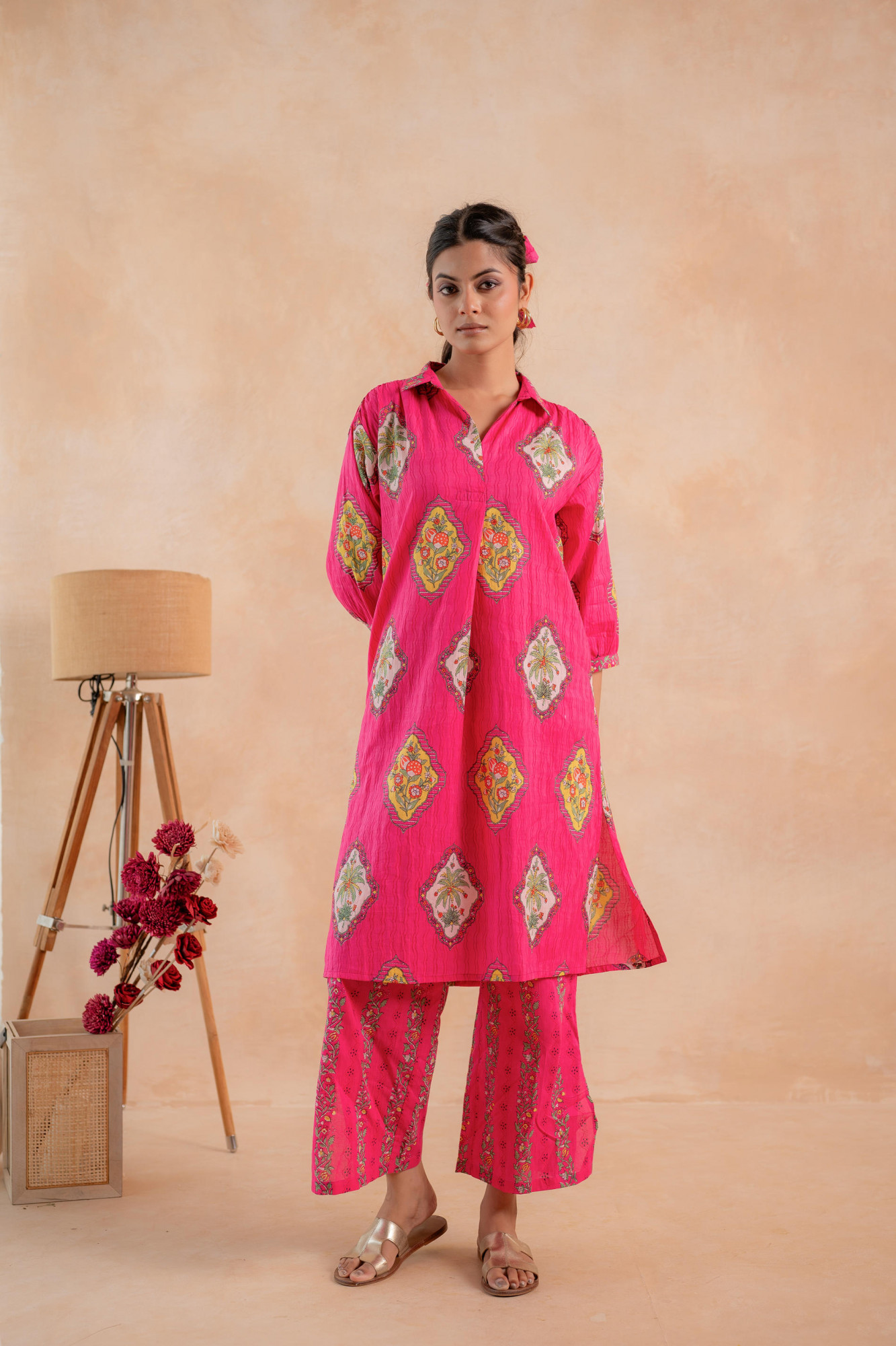A striking rani-pink kurta set adorned with traditional heritage-inspired motifs, paired with coordinated printed straight pants. Designed with a relaxed silhouette and vibrant color palette, this ensemble blends festive charm with everyday comfort.Pack of Content Each Size Set:- 1 KURTA, 1 PANT Top Type :- Kurta Top Pattern :- Printed Print Type :- Ethnic Top Fabric :- Cotton Top Design Styling :- Straight Kurta Top Hemline :- Straight Top Length :- Knee length Top Shape :- Straight Neck :- Shirt collar with V-opening Sleeve Length :- Three-quarter sleeves Sleeve Styling :- Regular with button cuffed Top Closure :- Slip-on Bottom Type :- Pant Bottom Fabric :- Cotton Bottom Pattern :- Printed Waistband :- Partially elasticated Occasion :- Casual Ornamentation :- Buttons
