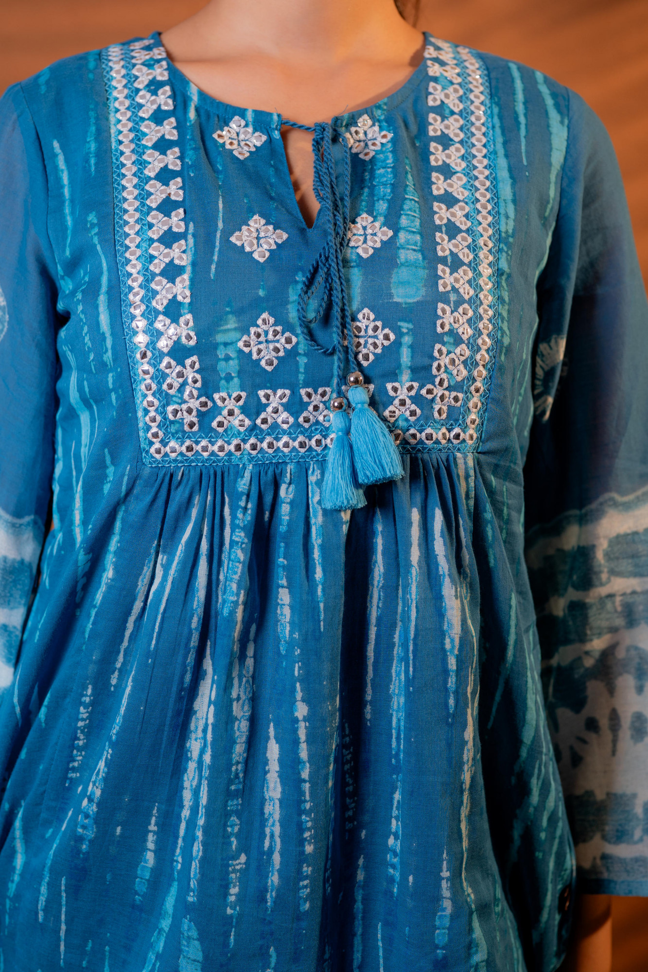 This stylish teal blue ethnic tunic features traditional tie-dye inspired prints with a beautifully detailed contrast yoke. Designed in a relaxed flared silhouette, it offers effortless comfort and a graceful fall. The wide sleeves and tasselled neckline add a bohemian touch, making it perfect for casual ethnic wear and contemporary Indo-western styling.Pack of Content Each Size Set:- 1 TUNIC Top Type :- Tunic Top Pattern :- Printed Print Type :- Tie-dye print Top Fabric :- Cotton Top Design Styling :- A-line Short Kurta Top Hemline :- Flared Top Length :- Mid-thigh length Top Shape :- A-line Neck :- Round neck with Tie-up tassels Sleeve Length :- Full Sleeve Styling :- Bell Top Closure :- Slip-on Occasion :- Casual Ornamentation :- Tassels , Dori, Threads
