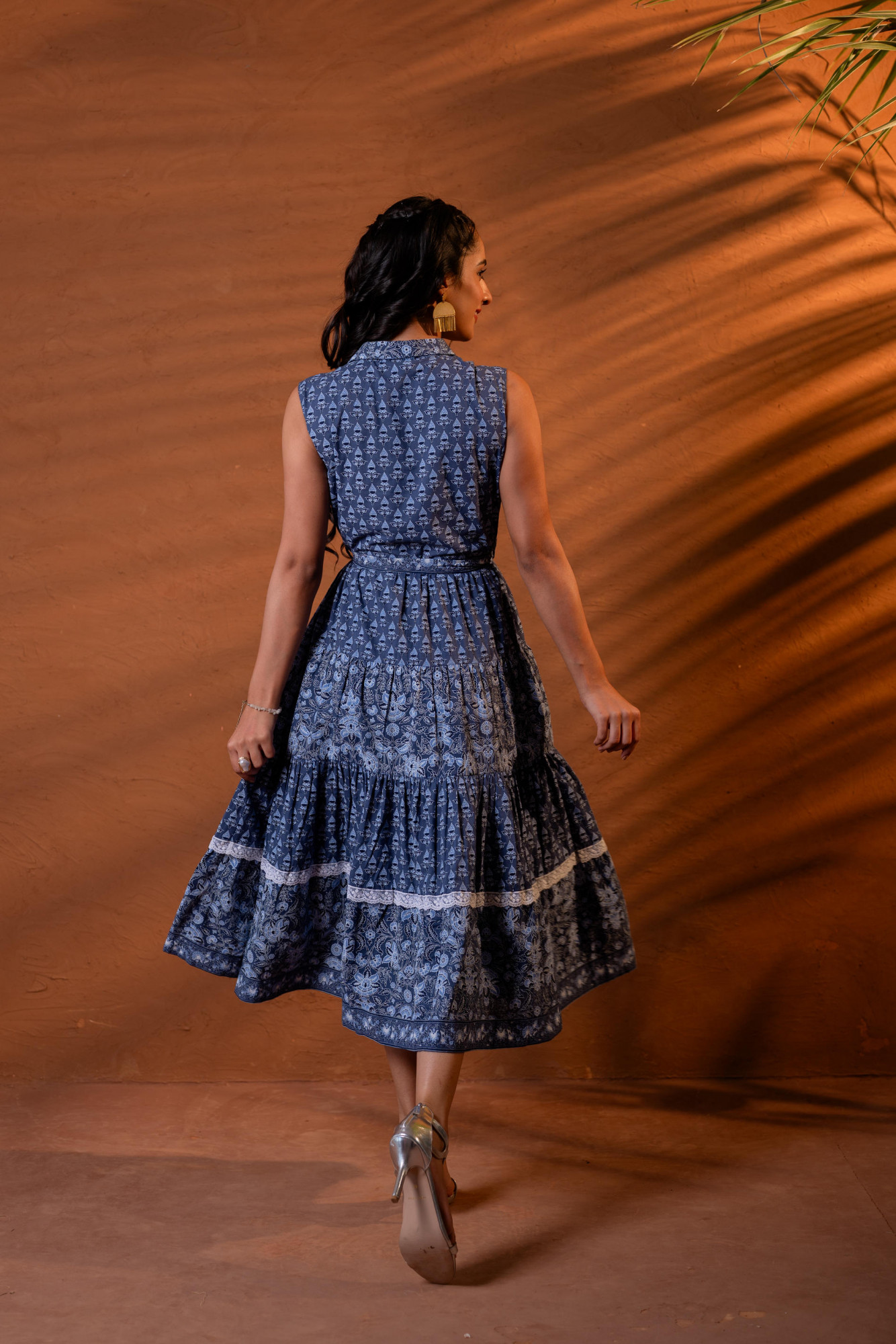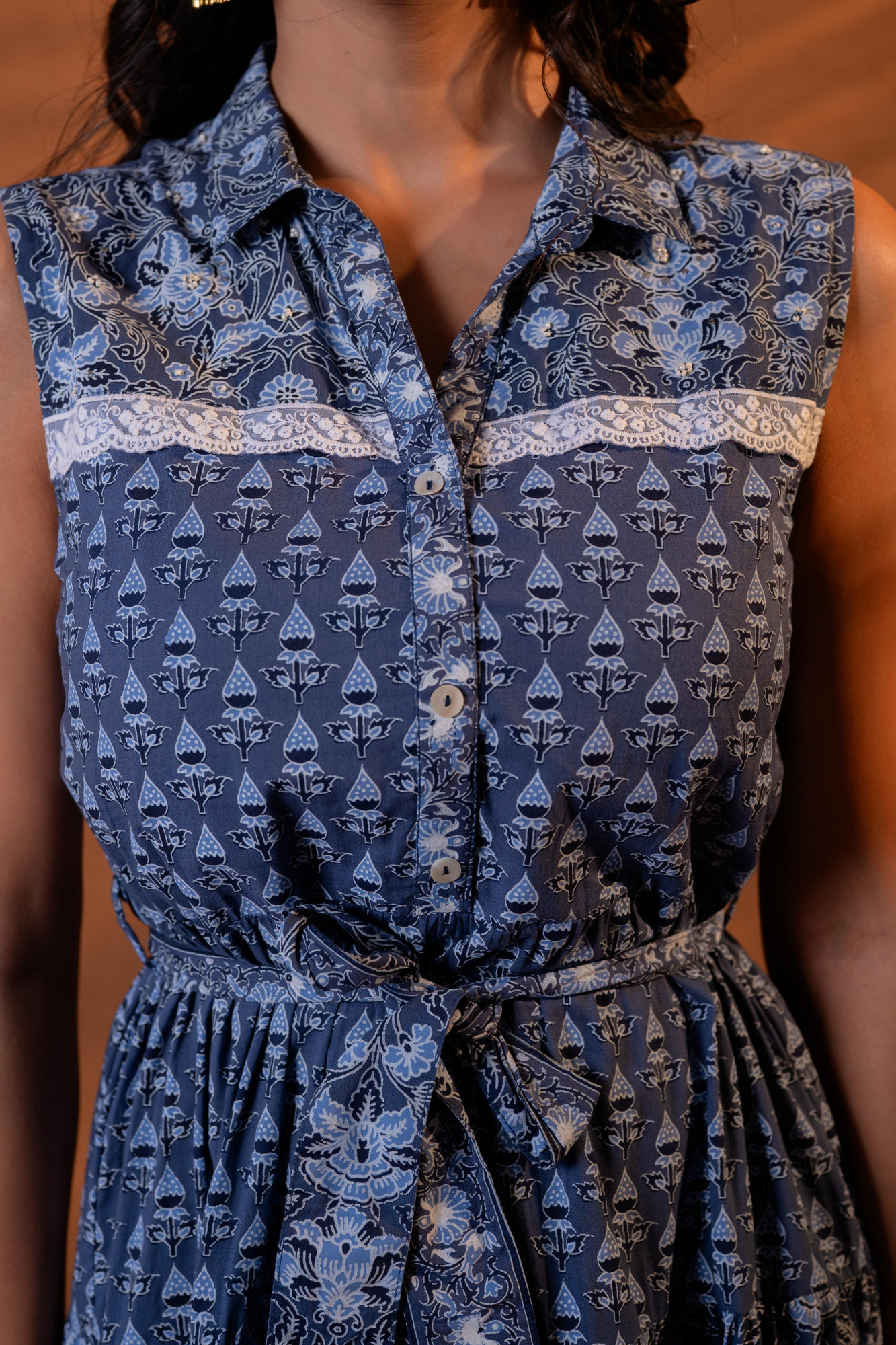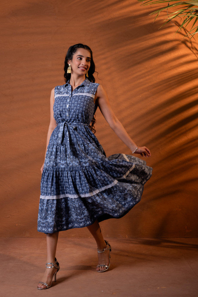 A graceful indigo long dress featuring intricate heritage-inspired motifs arranged in soft panel tiers. Designed with a structured shirt collar and sleeveless silhouette, the dress is cinched at the waist with a matching fabric tie belt for a flattering shape. The flared gathered skirt and border detailing at the hem add movement and timeless charm, making it perfect for effortless day-to-evening elegance.Pack of Content :- 1 LONGDRESS , 1 BELTTop Type :- Dress Top Pattern :- Printed Print Type :- Ajrakh Top Fabric :- Cotton Top Design Styling :- Tiered A-line long dress Top Hemline :- Flared Top Length :- Calf length Top Shape :- A-line Neck :- Shirt collar Top Closure :- Front button-down >Ornamentation :- Lace,Buttons,Belt