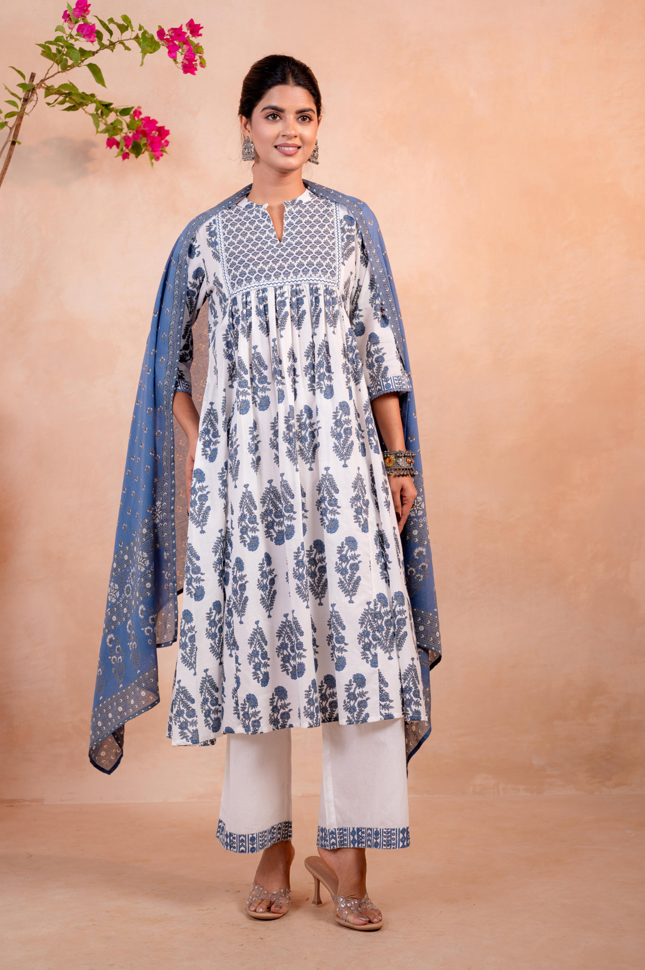Effortlessly graceful, this ivory Anarkali-style kurta set is adorned with classic indigo floral block-inspired prints. The intricately patterned yoke adds structure, while the softly gathered silhouette creates elegant movement. Paired with solid straight pants featuring subtle border detailing and a coordinating indigo dupatta with delicate motifs, this ensemble is perfect for refined daytime festivities and elegant cultural occasions.Top Type :- Kurta Dupatta(Yes, No) :- Yes Top Pattern :- Printed Print Type :- Floral Top Fabric :- Cotton Top Design Styling :- A-Line gathered kurta Top Hemline :- Flared Top Length :- Knee Length Top Shape :- A-line Neck :- Round neck with V-notch Sleeve Length :- Three-quarter sleeves Top Closure :- Slip-on Bottom Type :- Pant Bottom Fabric :- Cotton Bottom Pattern :- Solid Dupatta Fabric :- Cotton