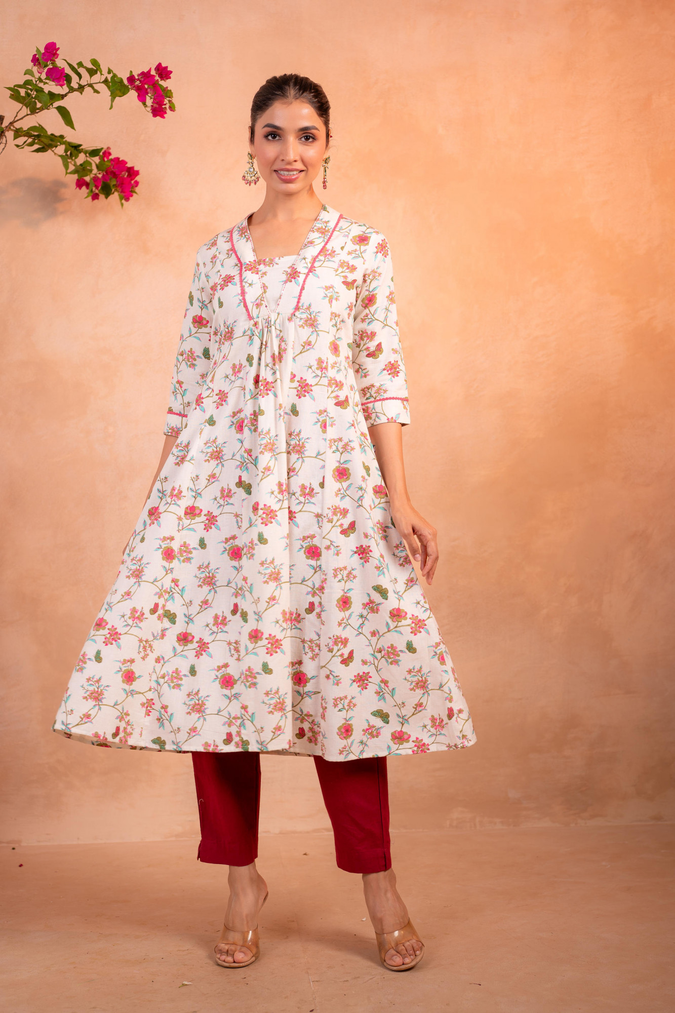 An elegant ivory kurta highlighted with delicate all-over floral prints in soft pink and green hues. Designed with a flattering empire silhouette and subtle contrast piping, this kurta blends timeless femininity with everyday comfort—perfect for refined daytime dressing.Pack of Content :- 1 KURTATop Type :- Kurta Top Pattern :- Printed Print Type :- Floral Top Fabric :- Cotton Top Design Styling :- Empire-line kurta Top Hemline :- Flared Top Length :- Knee length Top Shape :- A-line Neck :- V-neck Sleeve Length :- Three-quarter sleeves Top Closure :- Slip-on >Ornamentation :- Lace