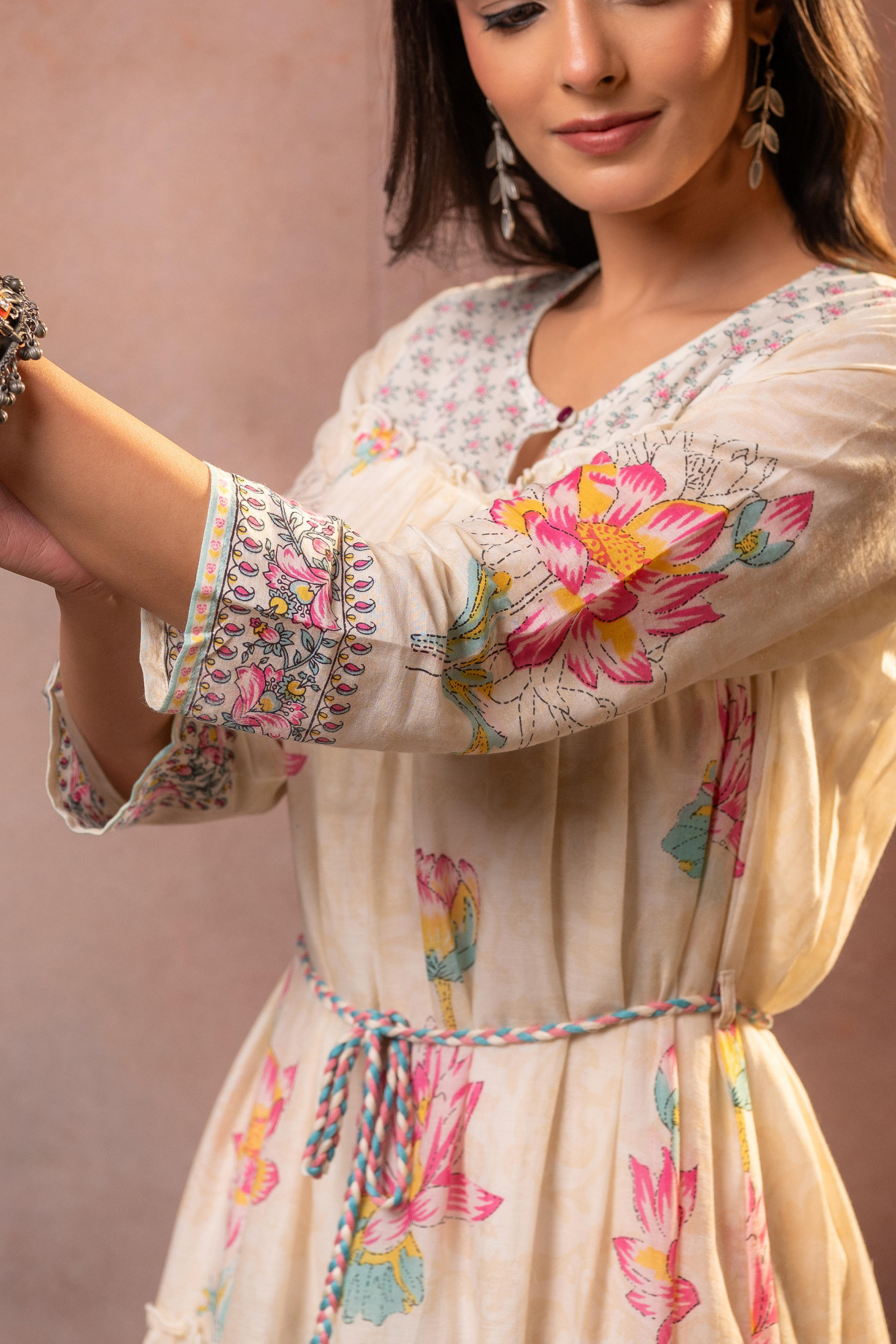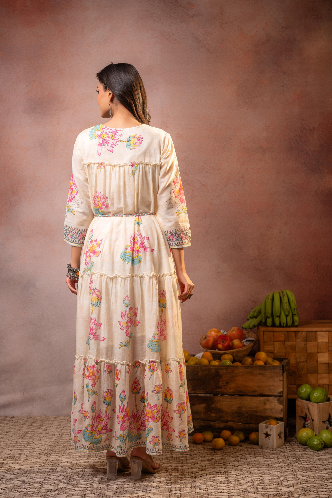 An elegant ivory maxi dress adorned with soft pastel floral prints, designed with a tiered silhouette and drawstring waist. Finished with delicate embroidery accents on sleeves and neckline, this piece blends artisanal charm with effortless bohemian elegance.Pack of Content Each Size Set:- 1 LONGDRESS, 1 DORI Top Type :- Dress Top Pattern :- Printed Print Type :- Floral Top Fabric :- Cotton Top Design Styling :- A-Line Long Dress Top Hemline :- Flared Top Length :- Ankle length Top Shape :- A-line Neck :- Round neck with V-notch Sleeve Length :- Three-quarter sleeves Sleeve Styling :- Regular Top Closure :- Slip-on Occasion :- Semi-Festive Ornamentation :- Dori,Tassels