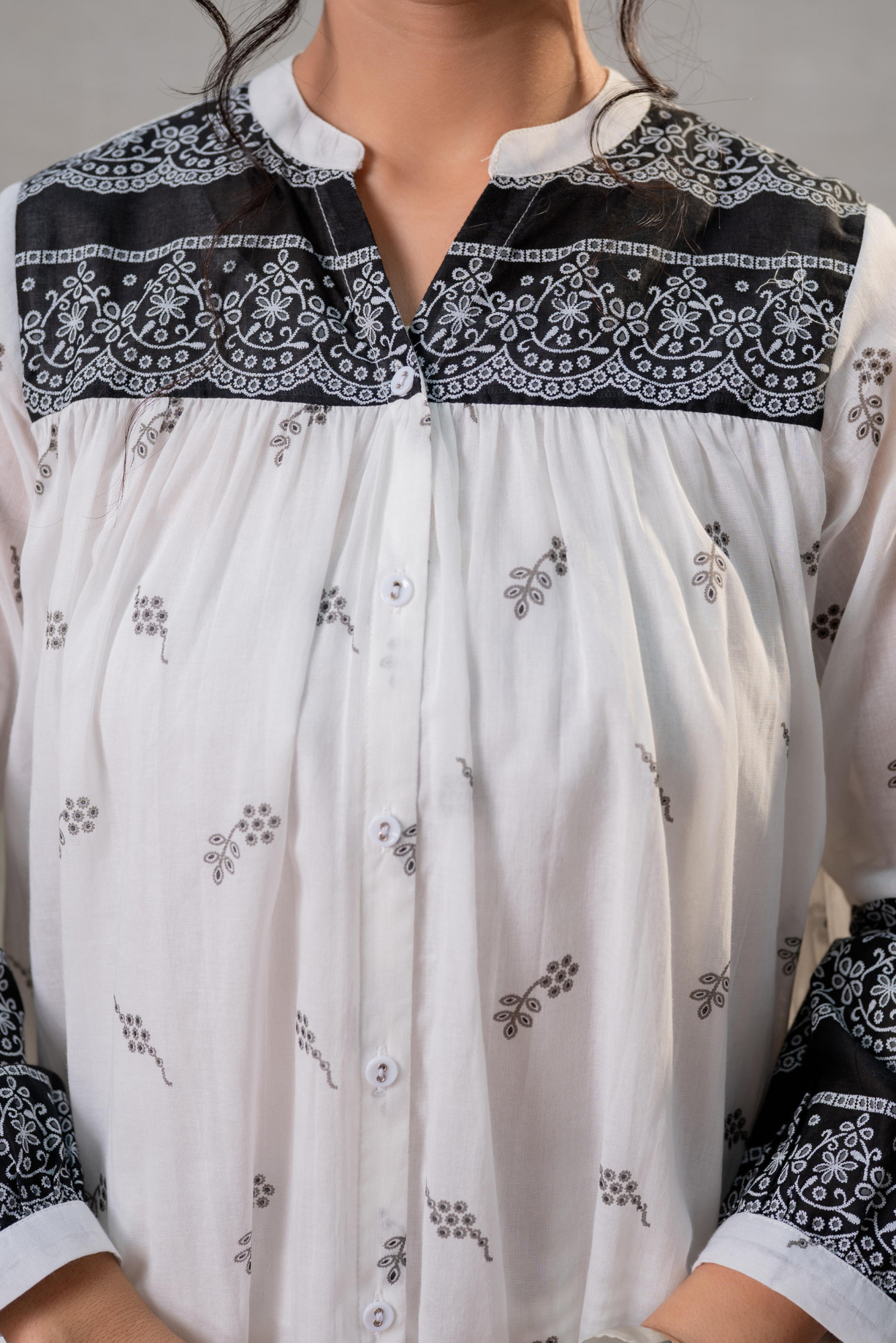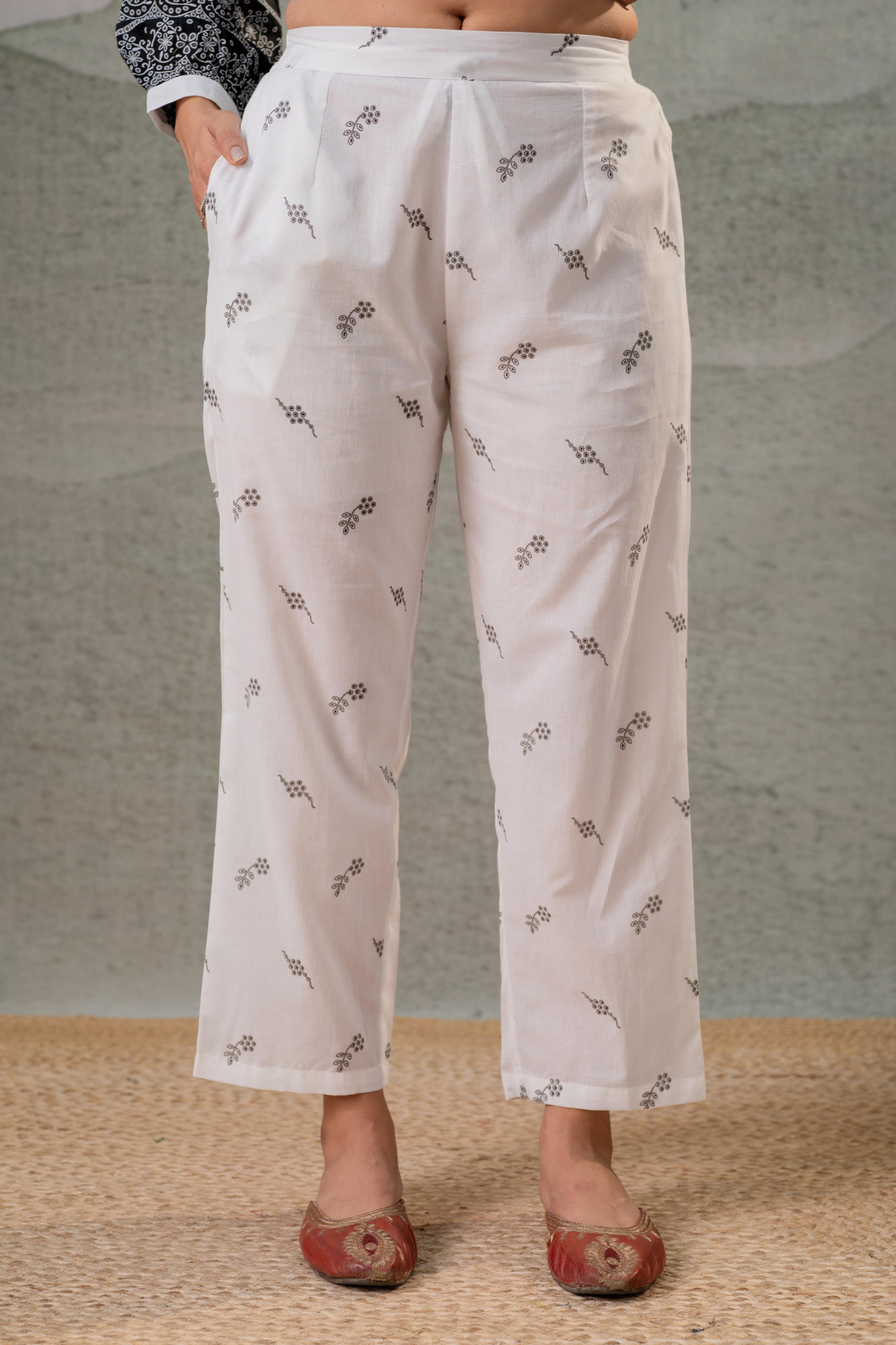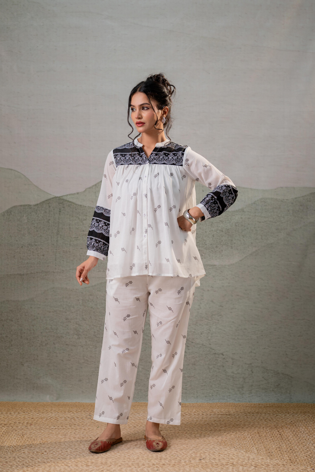 An effortlessly graceful White tunic set highlighted with delicate all-over motifs and contrast black yoke detailing. Designed for comfort and timeless appeal, this set blends handcrafted aesthetics with a relaxed contemporary silhouette, making it ideal for everyday ethnic wear.Top Type :- Tunic Dupatta(Yes, No) :- No Top Pattern :- Printed Print Type :- Ethnic Top Fabric :- Cotton Top Design Styling :- Front Gather Tunic Top Hemline :- Straight Top Length :- Hip length Top Shape :- Straight Neck :- Split neckline with band collar Sleeve Length :- Full Sleeve Styling :- Balloon sleeves Bottom Type :- Pant Bottom Fabric :- Cotton Bottom Pattern :- Printed Ornamentation :- NA