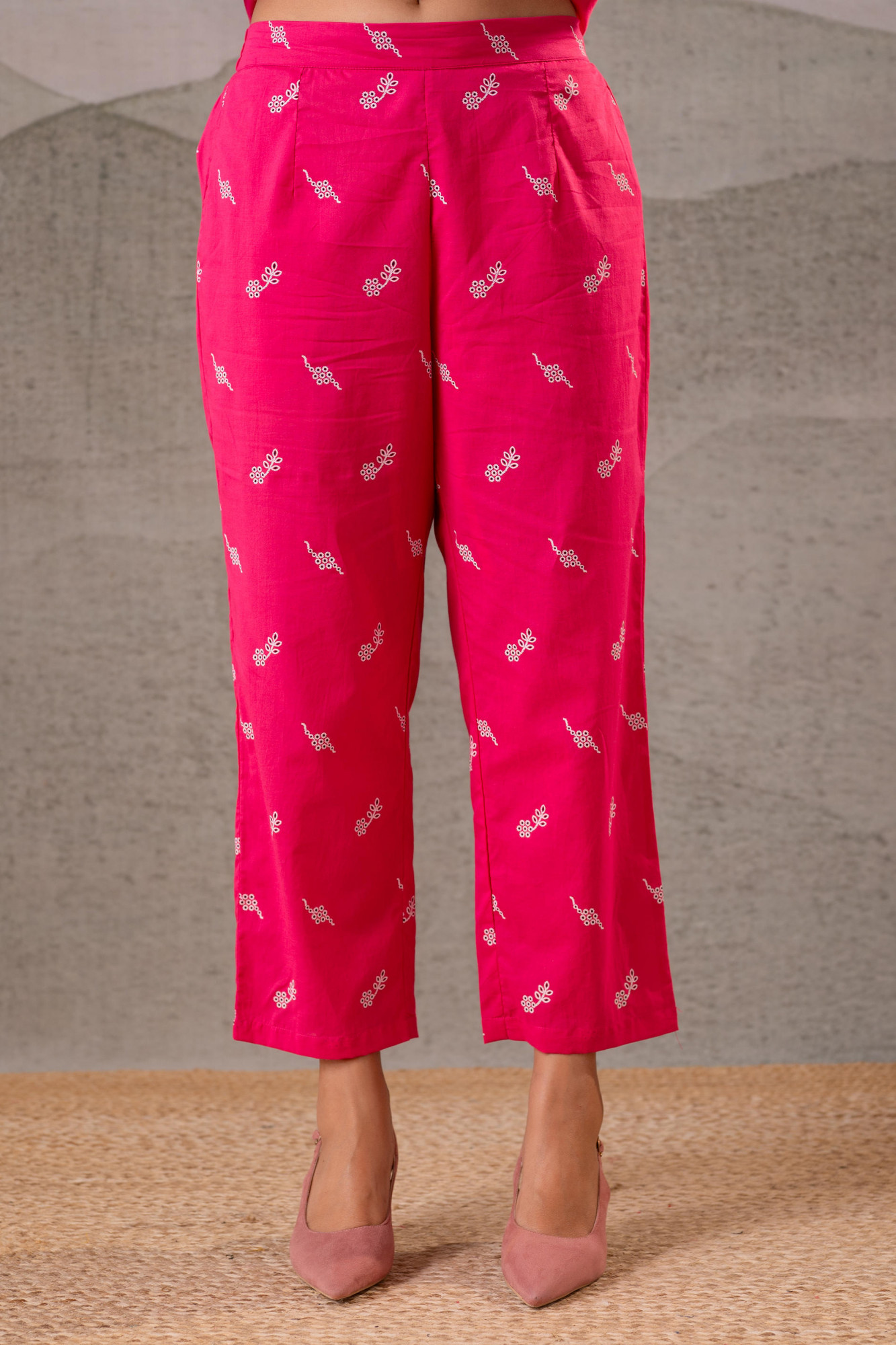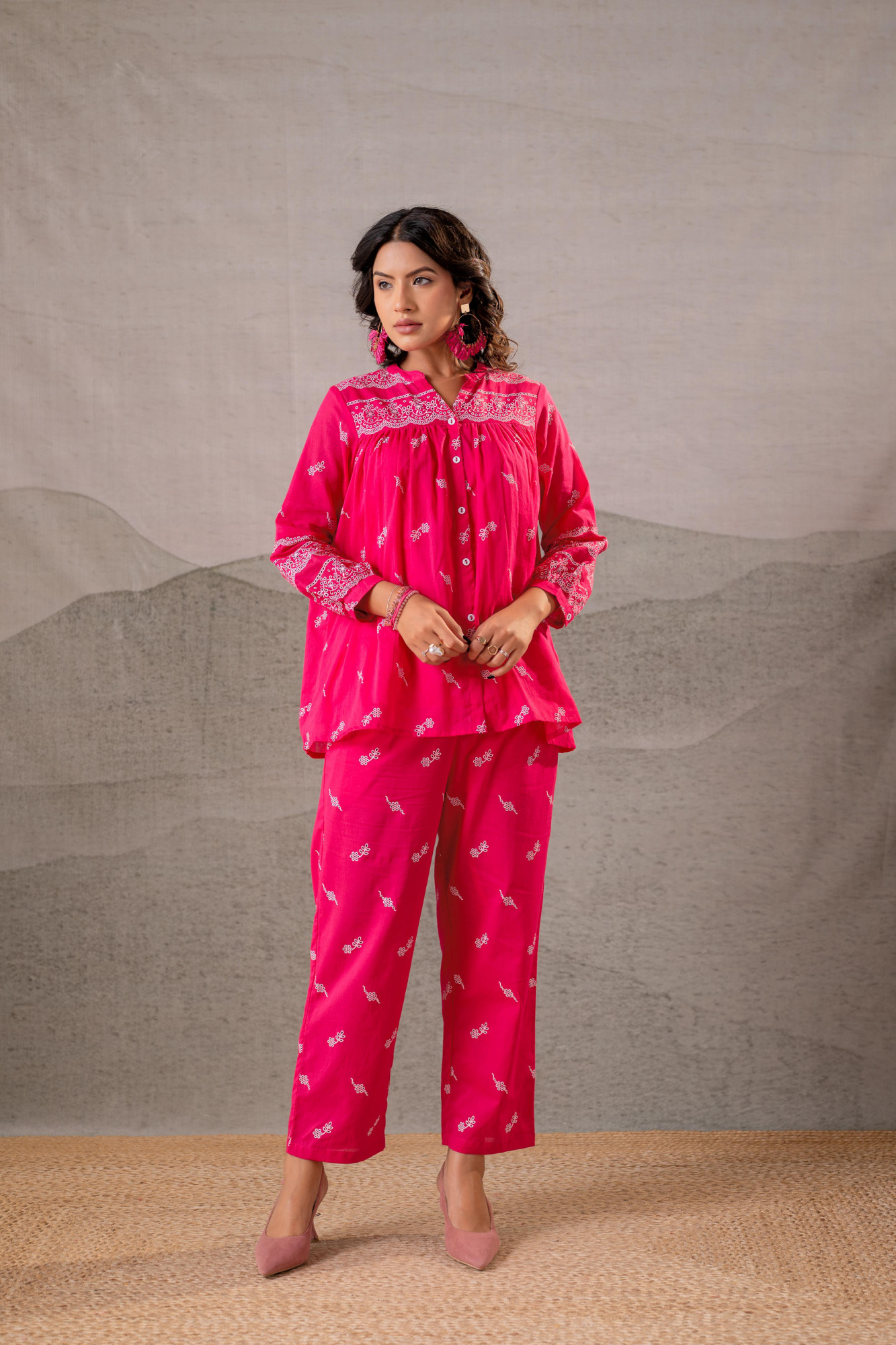 An effortlessly graceful fuchsia tunic set highlighted with delicate all-over motifs and contrast white yoke detailing. Designed for comfort and timeless appeal, this set blends handcrafted aesthetics with a relaxed contemporary silhouette, making it ideal for everyday ethnic wear.Top Type :- Tunic Dupatta(Yes, No) :- No Top Pattern :- Printed Print Type :- Ethnic Top Fabric :- Cotton Top Design Styling :- Front Gather Tunic Top Hemline :- Straight Top Length :- Hip length Top Shape :- Straight Neck :- Split neckline with band collar Sleeve Length :- Full Sleeve Styling :- Balloon sleeves Bottom Type :- Pant Bottom Fabric :- Cotton Bottom Pattern :- Printed Ornamentation :- NA