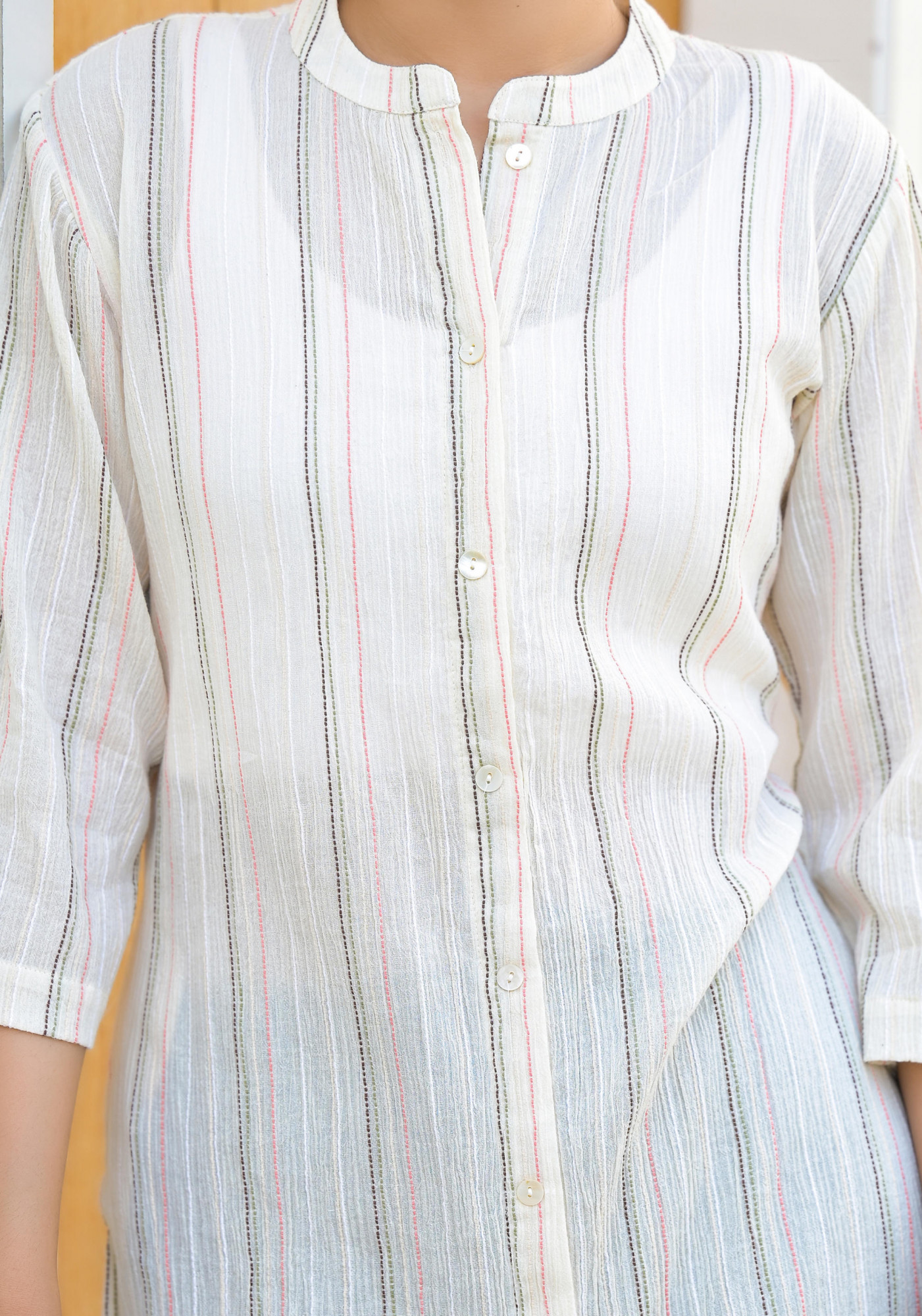 Ivory solid cotton kurta featuring delicate thread work and a button closure. This knee-length, straight-cut design is complemented by a mandarin collar and three-quarter regular sleeves, offering a crisp, classic lookPack of Content :- 1 Kurta Color :- Ivory Top Type :- Kurta Top Pattern :- Solid Top Fabric :- Cotton Top Design Styling :- Straight Top Hemline :- Straight Top Length :- Knee length Top Shape :- Straight Neck :- Mandarin Collar Sleeve Length :- Three Quarter Sleeves Top Closure :- Button Closure Ornamentation :- Buttons & thread Work
