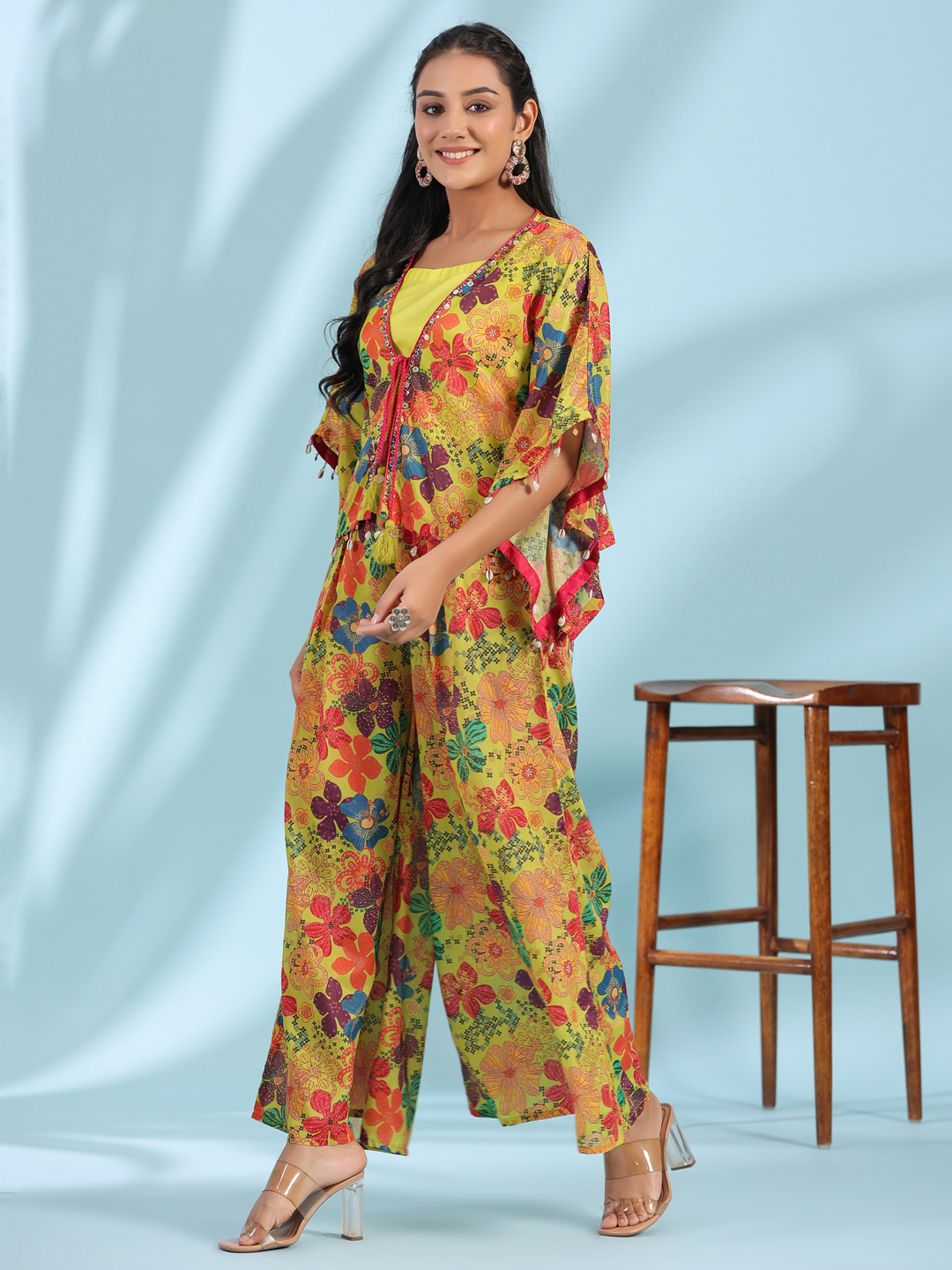 Step Into The Spotlight With Our Green Chinnon Printed Clothing Set. Chic Solid Crop Top Paired With Playful Printed Flared Pants And Matching Shrug, Igniting Adventure And Style. Beadwork Embellished For Added Charm.