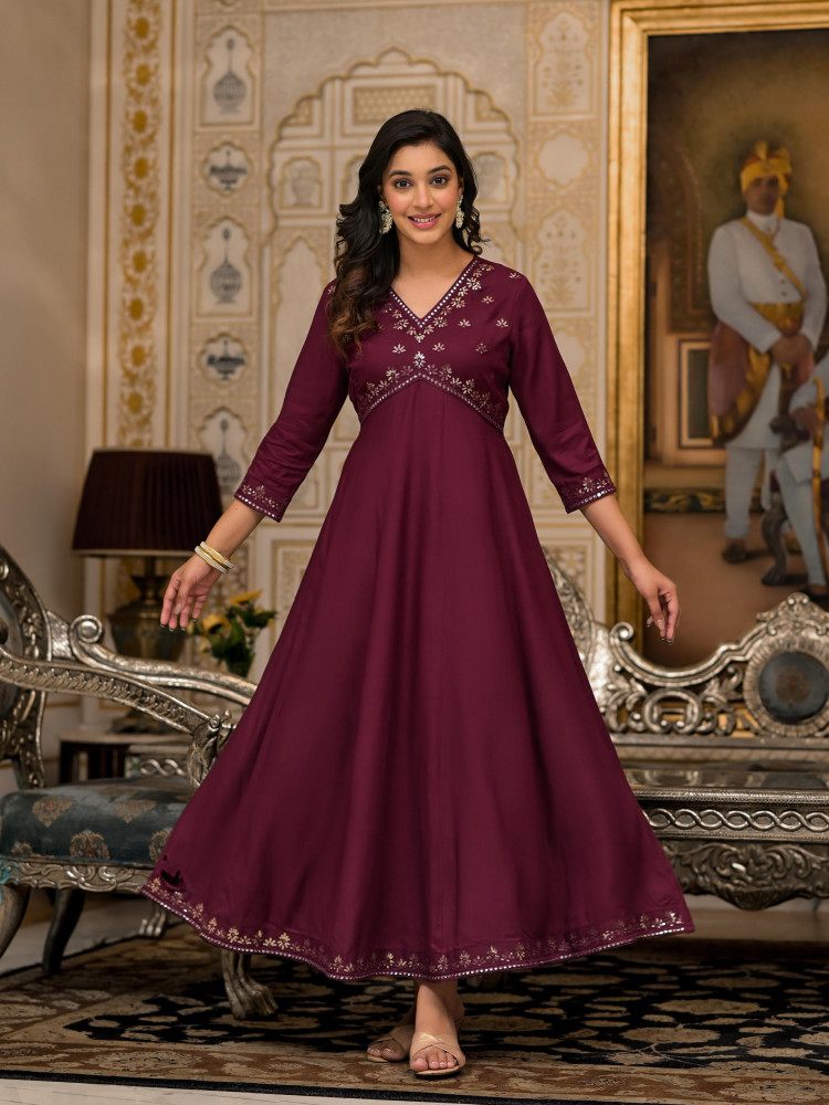 Wine Mirror Embroidered Liva Rayon Dress With Sequins. This Panelled, A-Line, Knee-Length Dress Features A Fit & Flare Design, V Neckline, And Three-Quarter Regular Sleeves. Perfect For Festive Occasions, It Combines Elegance With A Touch Of Sparkle.