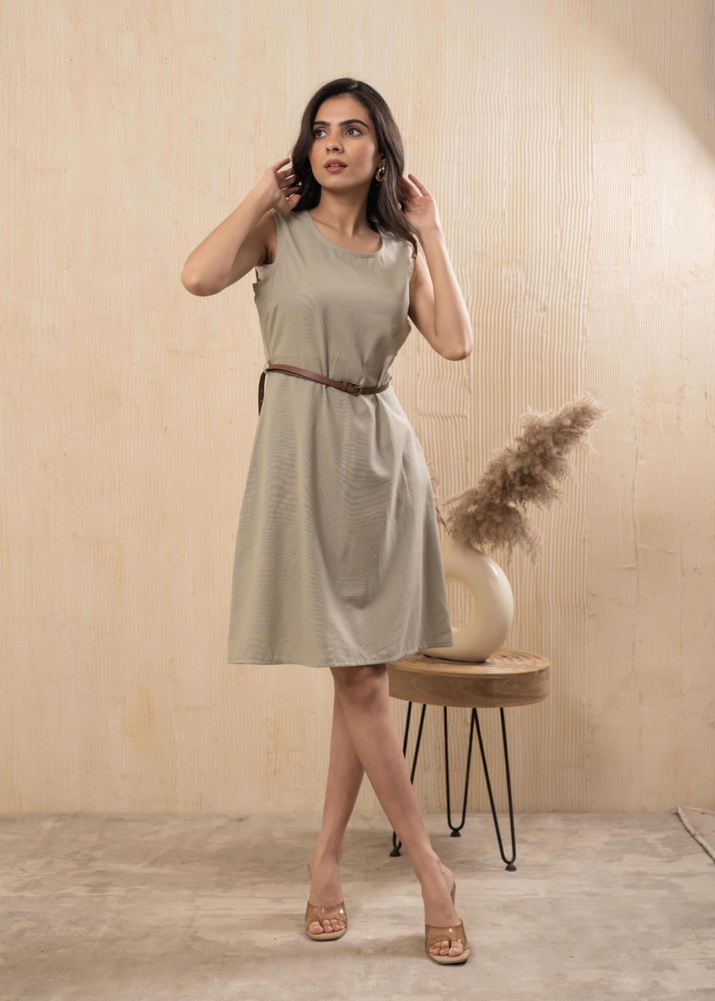 A minimal and elegant sleeveless A-line dress in a beige tone, designed with a clean round neckline and a comfortable midi length. The dress comes with a slim brown belt that cinches the waist for a flattering silhouette. Ideal for office wear, brunch outings, or casual daytime events, offering effortless sophistication and comfort.Top Type :- Dress Top Pattern :- Solid Top Fabric :- Cotton Top Design Styling :- Dress Top Hemline :- Straight Top Length :- Above Knee Top Shape :- A-Line Neck :- Round Neck Sleeve Length :- Sleeveless Top Closure :- Slip-On Occasion :- Casual Ornamentation :- Belt Dupatta Fabric :- Fit :- Fit & Flared