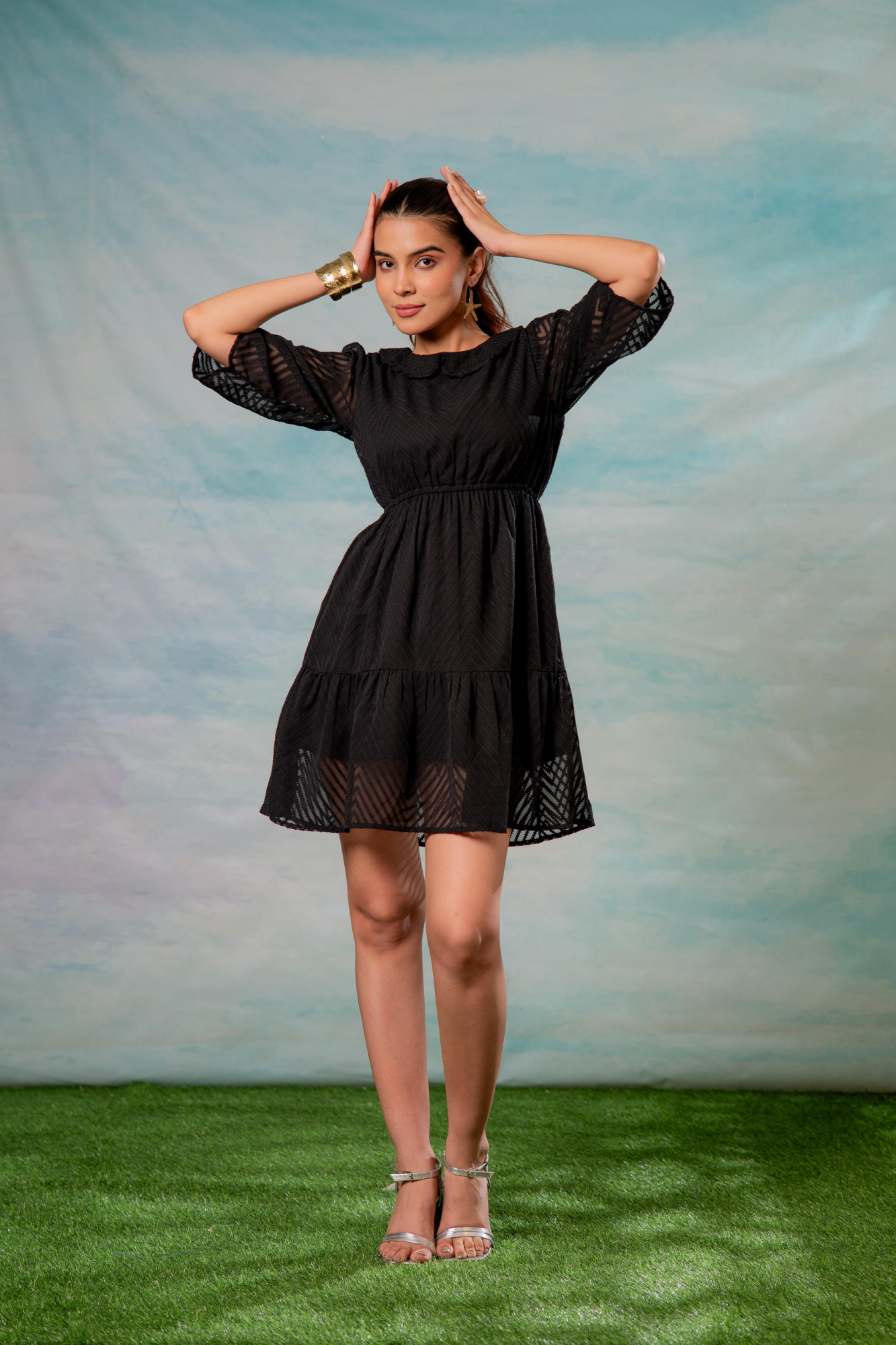 A chic black mini dress featuring sheer chevron-patterned fabric, a gathered waistline, and tiered flare hem. The dress blends elegance and modern minimalism with its lightweight, semi-sheer sleeves and textured surface, making it perfect for both casual outings and evening occasions.Top Type :- Dress Top Pattern :- Solid Print Type :- Chevron Top Fabric :- Polyester Top Design Styling :- Dress Top Hemline :- Flared Top Length :- Above Knee Top Shape :- A-Line Neck :- Round Neck Sleeve Length :- Three Quarter Sleeves Top Closure :- Slip-On Occasion :- Casual Dupatta Fabric :- Fit :- Fit & Flared