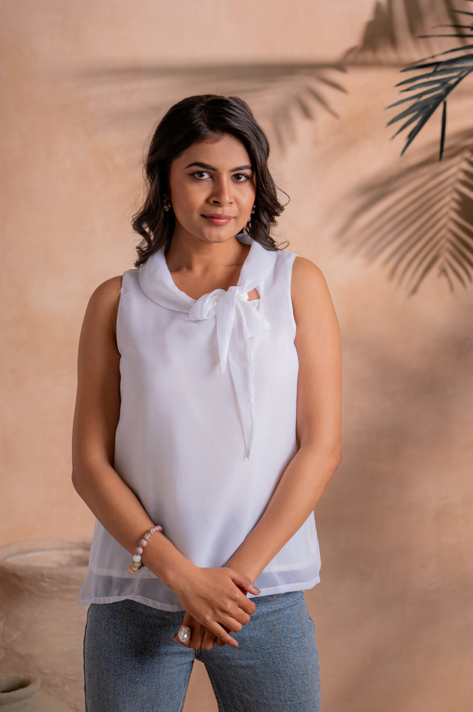 This elegant white sleeveless top features a chic bow-tie Neck : -line with a soft drape, giving it a refined and feminine appeal. Crafted from a lightweight textured fabric with a sheer layered hem, it offers a sophisticated yet modern look. The clean silhouette, subtle detailing, and breathable material make it perfect for workwear, brunch outings, or polished everyday styling.Pack of Content Each Size :-1 Top Fabric :- Top-100% Man Made Fiber Top Pattern : -Solid Top Design Styling : -Straight Top Top Hemline : -Straight Top Length : -Hip length Neck : -Bow-tie Neck : -line