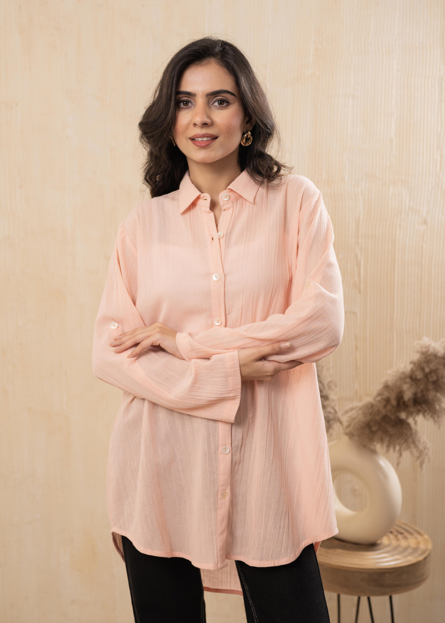 Stay effortlessly elegant with this soft peach oversized shirt tunic, designed in a fluid drapey fabric that gives a clean and minimal look. Featuring a classic shirt collar, full sleeves with cuffs, and a curved high-low hemline, this piece blends comfort with sophistication. Perfect for office days, brunch plans, or elevated casual wear, it offers a chic and breathable silhouette for all-day ease.Pack of Content Each Size :-1 Shirt Fabric :- Shirt-Cotton Top Pattern : -Solid Top Design Styling : -Oversized high-low hem Shirt Top Hemline : -Curved Top Length : -Mid-thigh Neck : -Shirt Collar Sleeve Length : -Full Sleeves Ornamentation : -Buttons