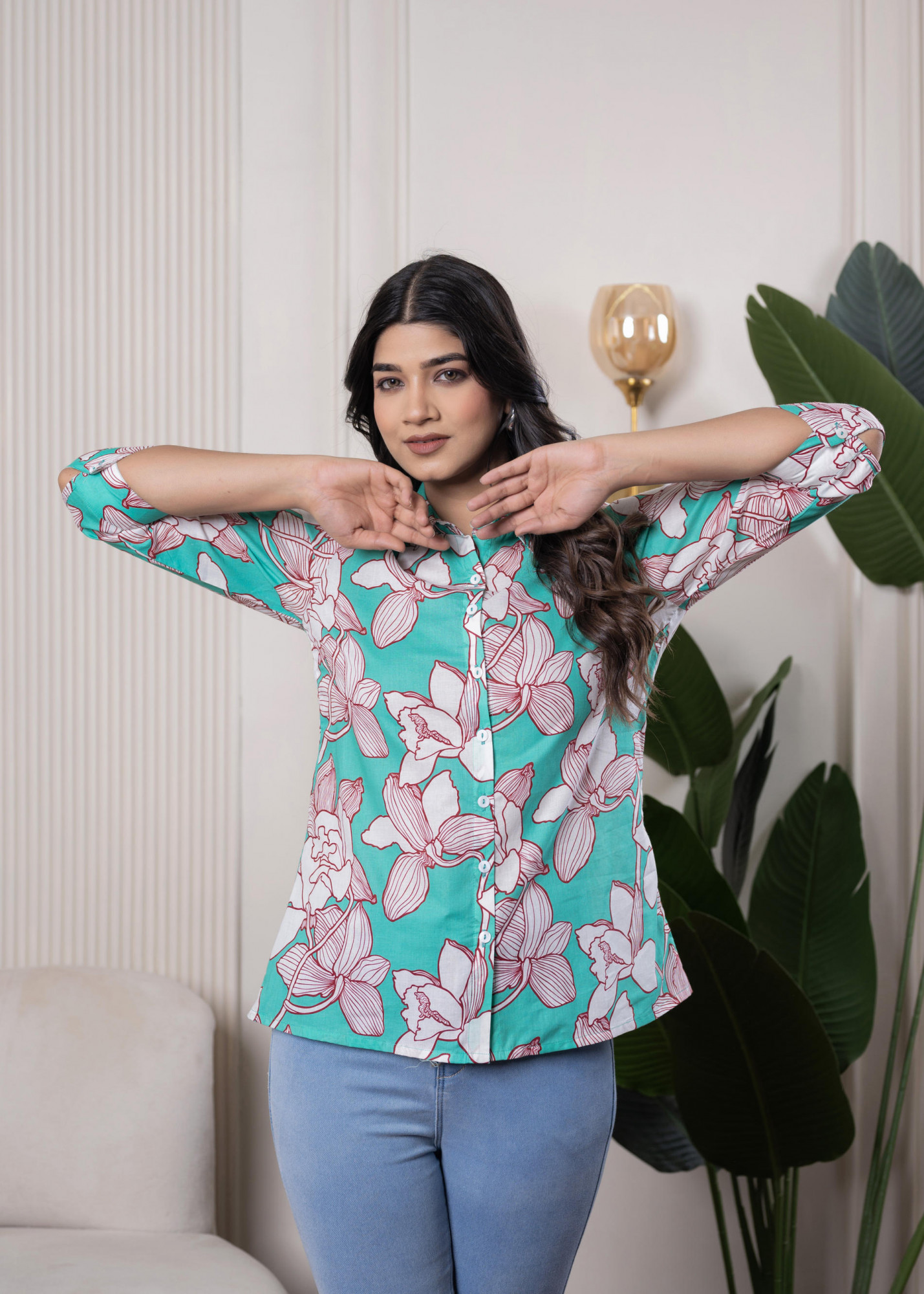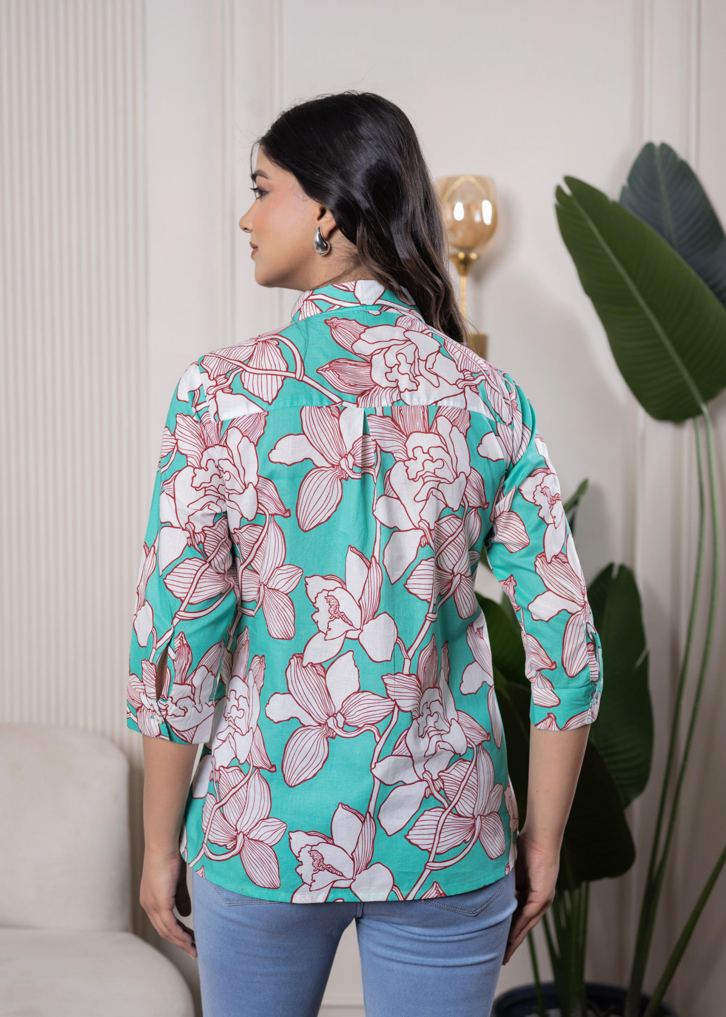 This vibrant turquoise floral shirt brings a refreshing blend of comfort and style. Crafted in a lightweight fabric featuring large pastel floral motifs, it offers a chic shirt collar, full button-down front, and 3/4th sleeves. The relaxed silhouette and bold yet feminine print make it a perfect choice for everyday wear, brunch outings, or effortless office chic. Pair it with denim, trousers, or skirts for a polished yet easygoing look.Top Type :- Shirt Top Pattern :- Printed Print Type :- Floral Top Fabric :- Cotton Top Design Styling :- Shirt Top Hemline :- Straight Top Length :- Hip Length Top Shape :- Straight Neck :- Shirt Collar Sleeve Length :- Three Quarter Sleeves Top Closure :- Front button closure Occasion :- Casual Ornamentation :- Buttons Dupatta Fabric :- Fit :- Straight