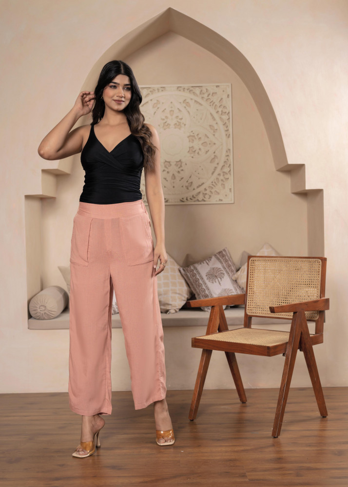 Beige wide-leg palazzo offer a breezy, relaxed silhouette perfect for all-day comfort. Designed with utility pockets, they provide a flexible fit. The fluid, drapey fabric enhances movement. Ideal for casual outings, work-from-home wear, travel, and warm-weather styling.