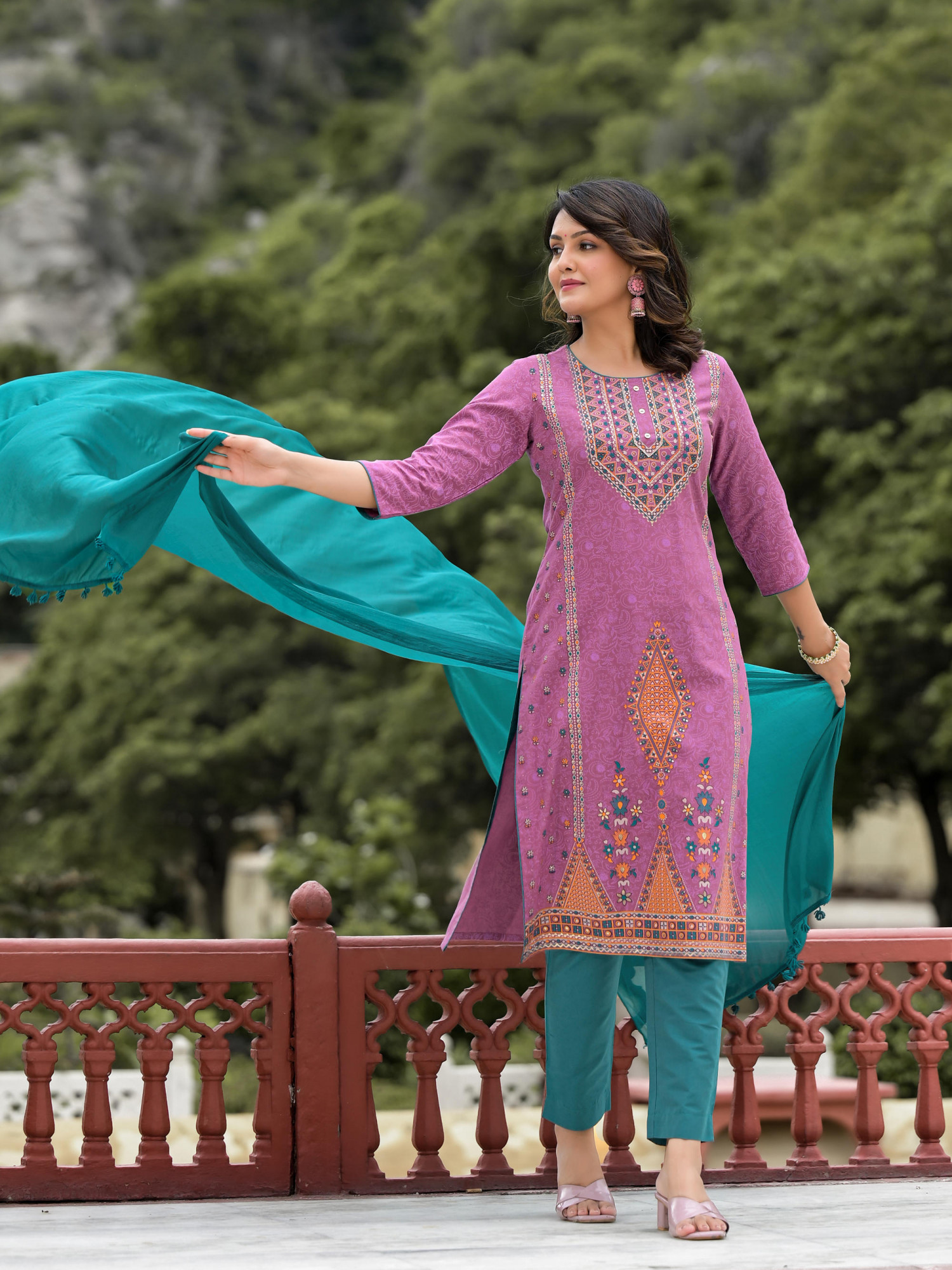 Lavender Ethnic Motif Printed Liva Rayon Kurta Pant And Dupatta Set With Buttons And Tassels On The Dupatta. Knee-Length, Straight Fit, Round Neck, And Three-Quarter Regular Sleeves. Includes Solid Slip-On Pants And Chiffon Dupatta With Tassels And Button Details.