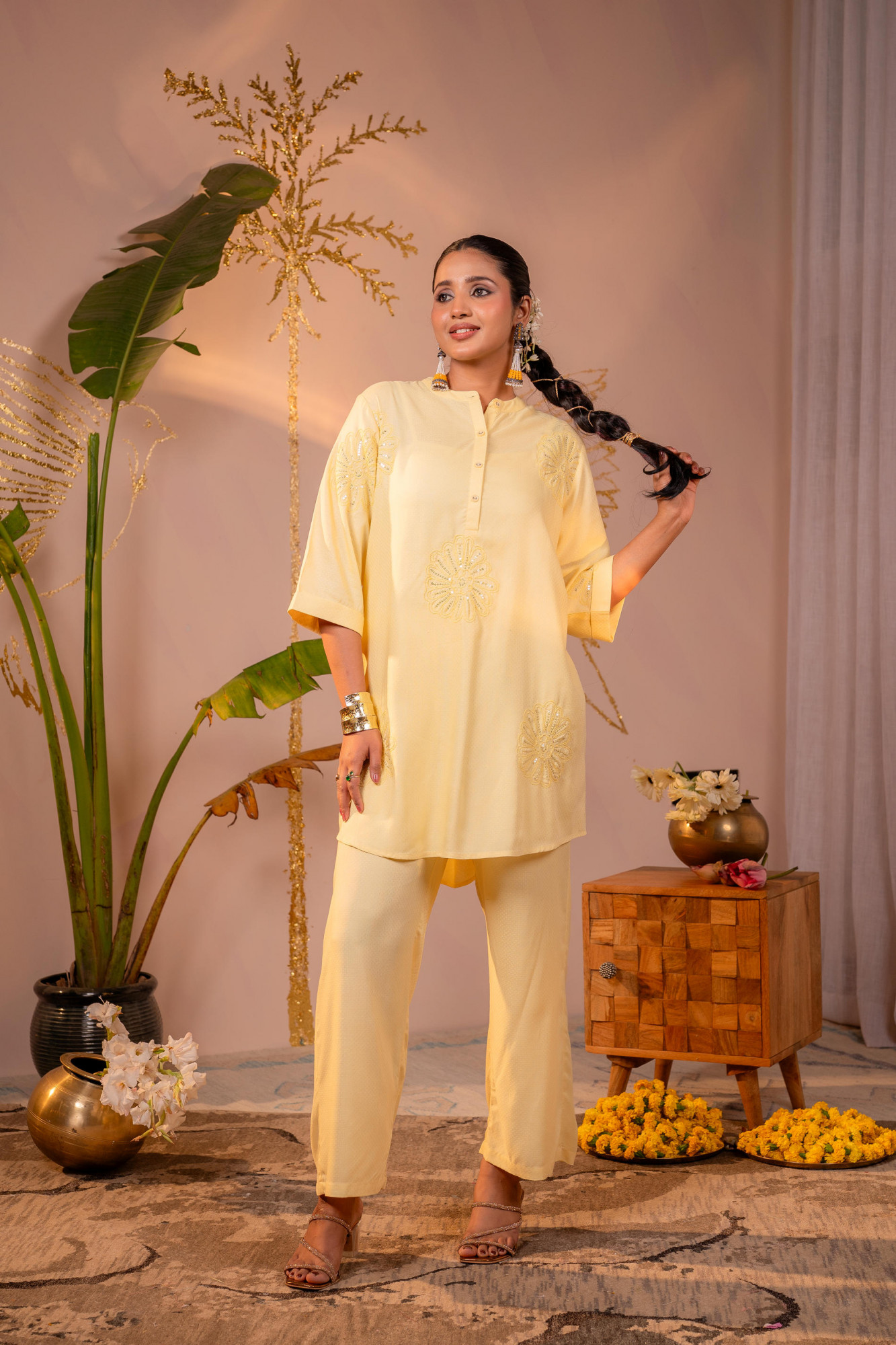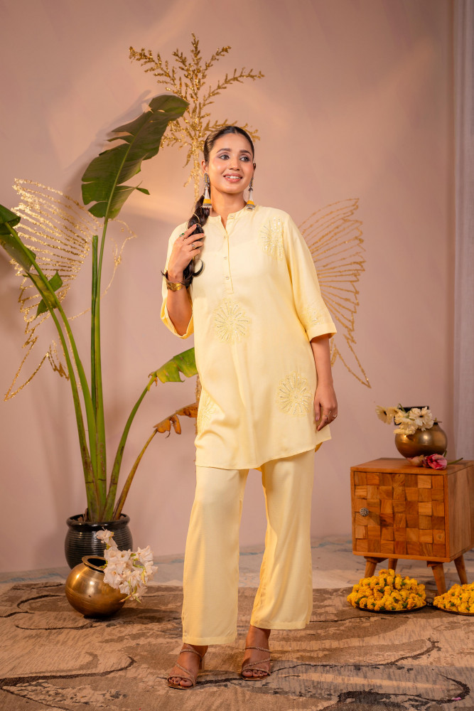 A calm and contemporary light yellow co-ord set designed for effortless day wear. Featuring delicate tonal embroidery on a relaxed kurta-style top paired with straight-fit pants, this ensemble blends minimal elegance with all-day comfort—perfect for modern ethnic wardrobes.Top Type :- Tops Dupatta(Yes, No) :- No Top Pattern :- Embroidered Print Type :- Floral Top Fabric :- Viscose Top Design Styling :- Straight Short Kurta Top Hemline :- High–low Top Length :- Mid-thigh length Top Shape :- Straight Neck :- Round neckline with short front placket Sleeve Length :- Three-quarter sleeves Sleeve Styling :- Bell sleeves Bottom Type :- Pant Bottom Fabric :- Viscose Bottom Pattern :- Solid Ornamentation :- Buttons,Threads,Sequins