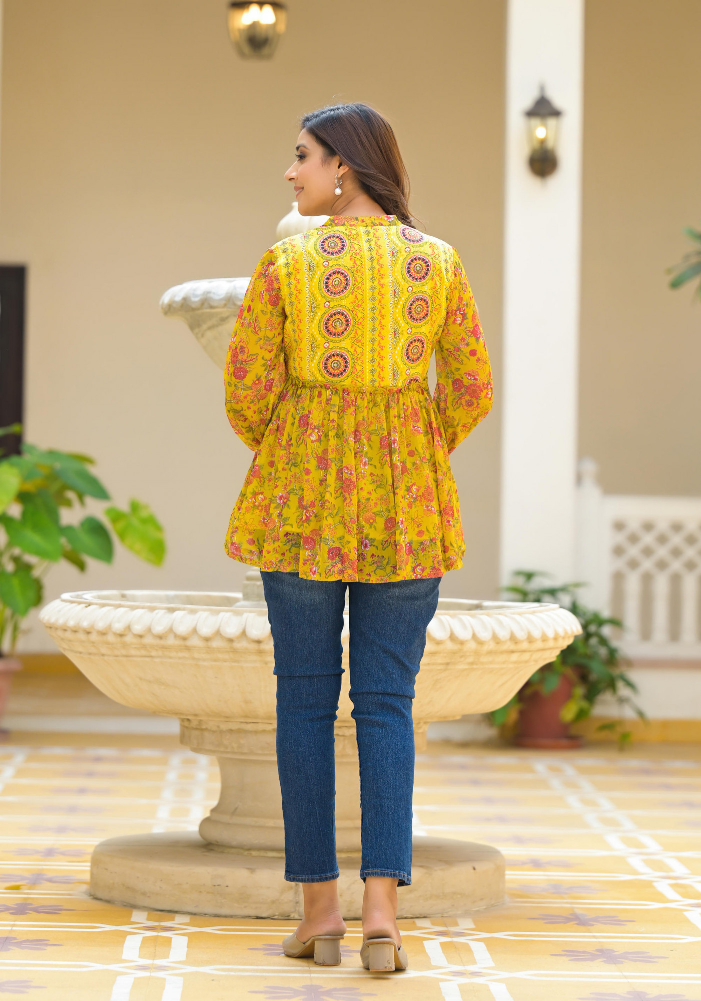 Lime Green Floral Printed Chiffon Tunic Exudes Elegance With Its Hip-Length Fit-And-Flare Silhouette. Featuring A Notch Neckline And Full Regular SleevesPack of Content :- 1 Tunic Color :- Lime Green Top Type :- Tunic Top Pattern :- Printed Print Type :- Floral Top Fabric :- Poly Chiffon Top Design Styling :- Gathers Top Hemline :- A-line Top Length :- Hip length Top Shape :- Fit & Flare Neck :- Notch neckline Sleeve Length :- Full Sleeves Top Closure :- Slip-On Length in Inch :- 29
