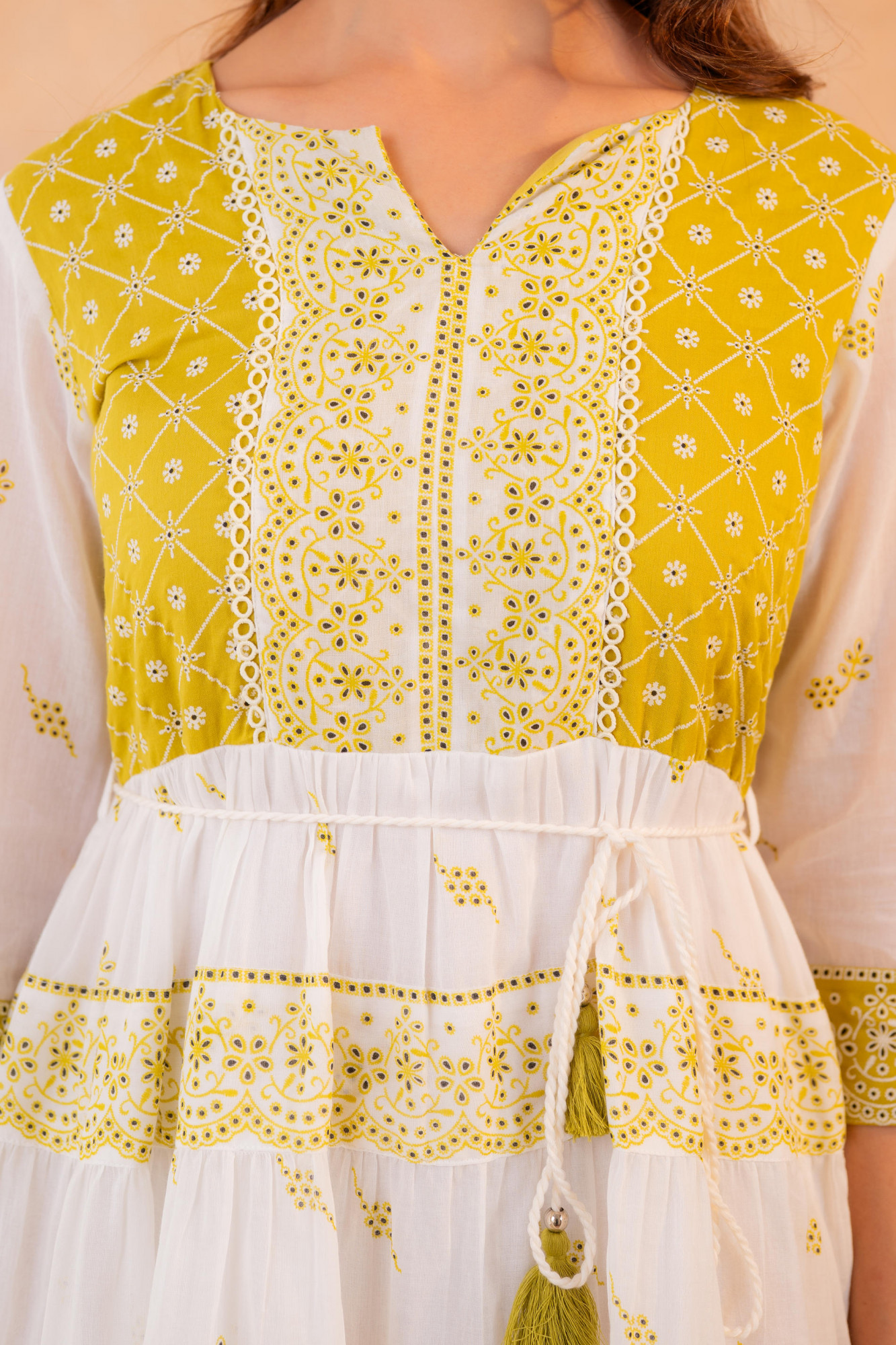 An elegant lime tiered dress highlighted with traditional block prints and delicate lace detailing. Featuring a gathered waist with tassel ties and a flared silhouette, this dress blends artisanal charm with contemporary comfort—ideal for relaxed festive days and cultural gatherings.Pack of Content Each Size Set:- 1 SHORTDRESS, 1 DORI Top Type :- Dress Top Pattern :- Printed Print Type :- Block Print Top Fabric :- Cotton Top Design Styling :- A-Line Short Dress Top Hemline :- Flared Top Length :- Above knee Top Shape :- A-line Neck :- Round neck with V-notch Sleeve Length :- Three-quarter sleeves Sleeve Styling :- Regular Top Closure :- Slip-on Occasion :- Casual Ornamentation :- Dori,Tassels,Lace