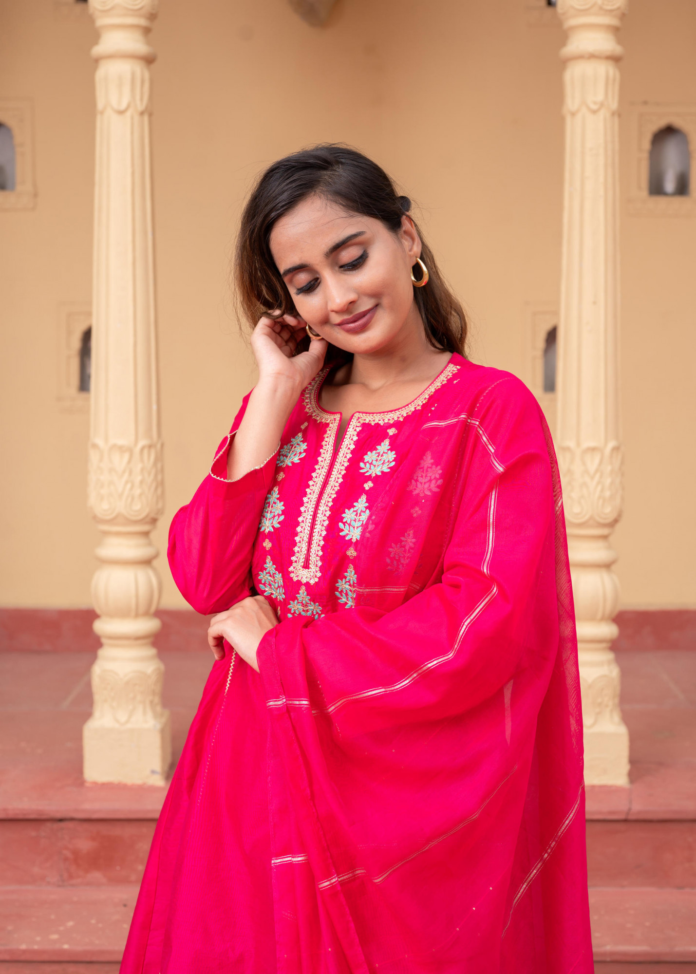 Elegant embroidered Fuchsia kurta pant and dupatta set with zari and sequin work. Features a calf-length straight-fit kurta, ankle-length viscose pants, inner, and dupatta. Perfect for festive occasions.Top Type :- Kurta Dupatta(Yes, No) :- Yes Top Pattern :- Embroidered Print Type :- Solid Top Fabric :- Man Made Fiber Top Design Styling :- Straight Top Hemline :- Straight Top Length :- Calf Length Top Shape :- Straight Neck :- Notch Neck Sleeve Length :- 3/4 Sleeve Sleeve Styling :- Regular Bottom Fabric :- Viscose Bottom Type :- Pants Bottom Pattern :- Solid Bottom Closure :- Slip On Ornamentation :- Zari, Sequence Dupatta Fabric :- Man Made Fiber Dupatta Pattern :- Solid Fit :- Regular Fit