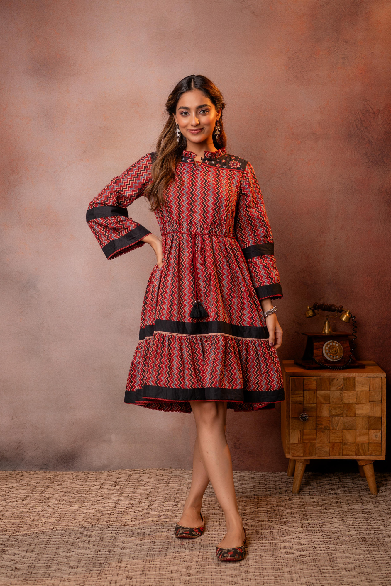 A striking maroon flared dress featuring bold chevron-inspired prints highlighted with contrasting black borders. Designed with a structured yoke and delicate detailing, this dress blends ethnic charm with contemporary silhouette. The flared hemline and statement sleeves enhance movement and elegance, making it a versatile choice for festive gatherings and cultural occasions.Pack of Content :- 1 SHORTDRESS, 1 DORITop Type :- Dress Top Pattern :- Printed Print Type :- Chevron Top Fabric :- Cotton Top Design Styling :- A-line midi dress Top Hemline :- Flared Top Length :- Knee length Top Shape :- A-line Neck :- Mandarincollar Sleeve Length :- Full Top Closure :- Slip-on >Ornamentation :- Dori, Tassels , Lace